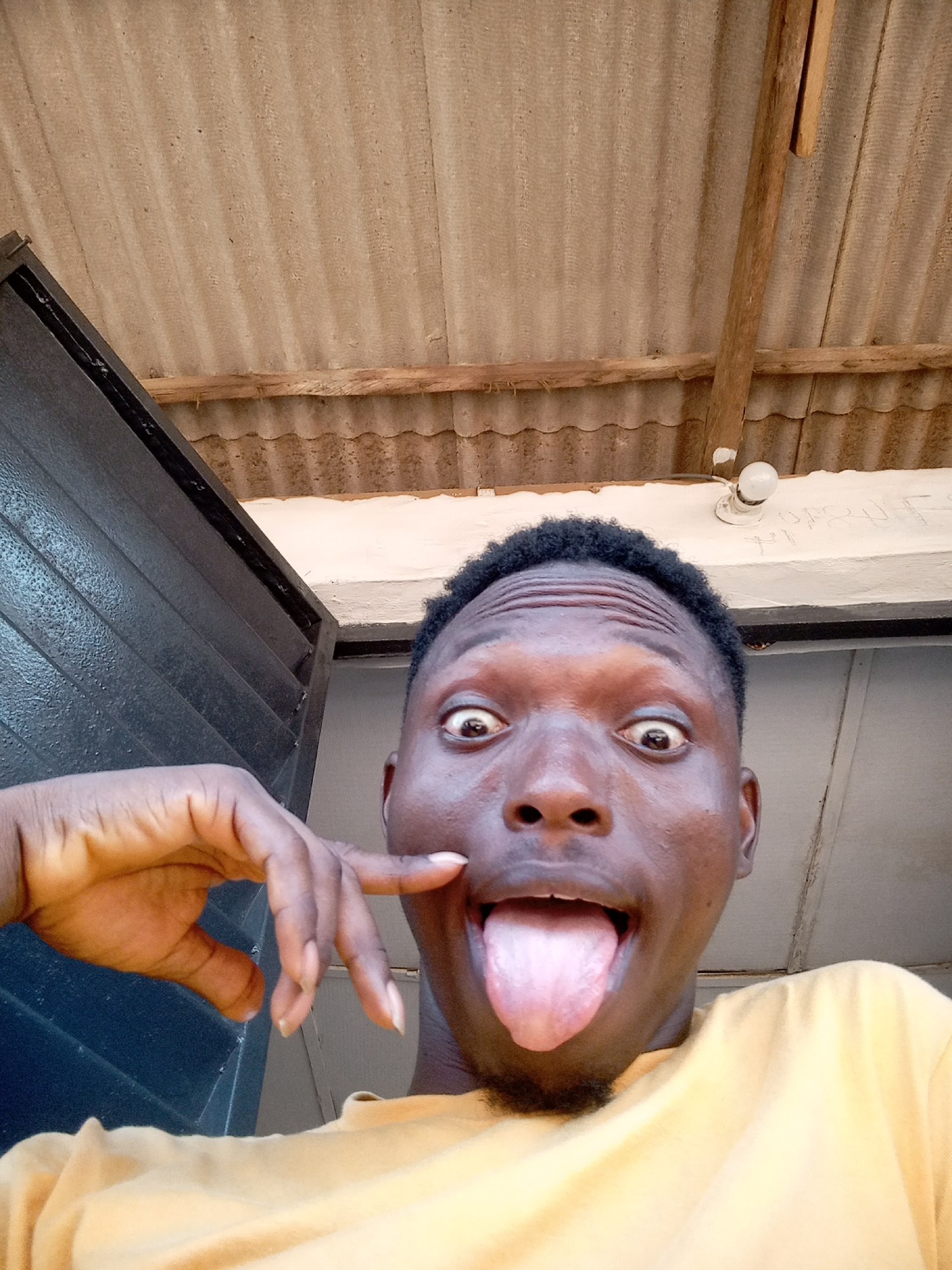 A young man with dark skin and short dark hair is featured in a close-up, low-angle selfie, making a playful expression. His eyes are wide open, and he is sticking out his tongue. His left hand is rai…read more