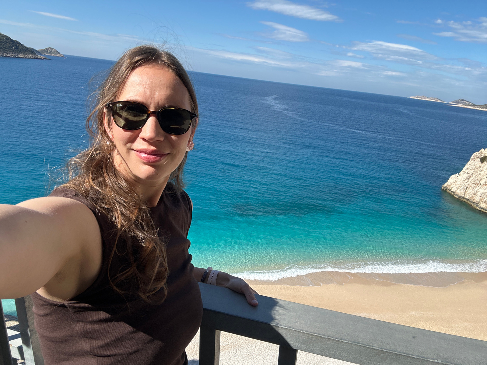A woman is standing on a balcony overlooking Kaputaş Beach in Kaş, Turkey. The beach has a sandy shore with turquoise water. A rocky cliff is visible on the left side of the frame. The woman is wearin…read more