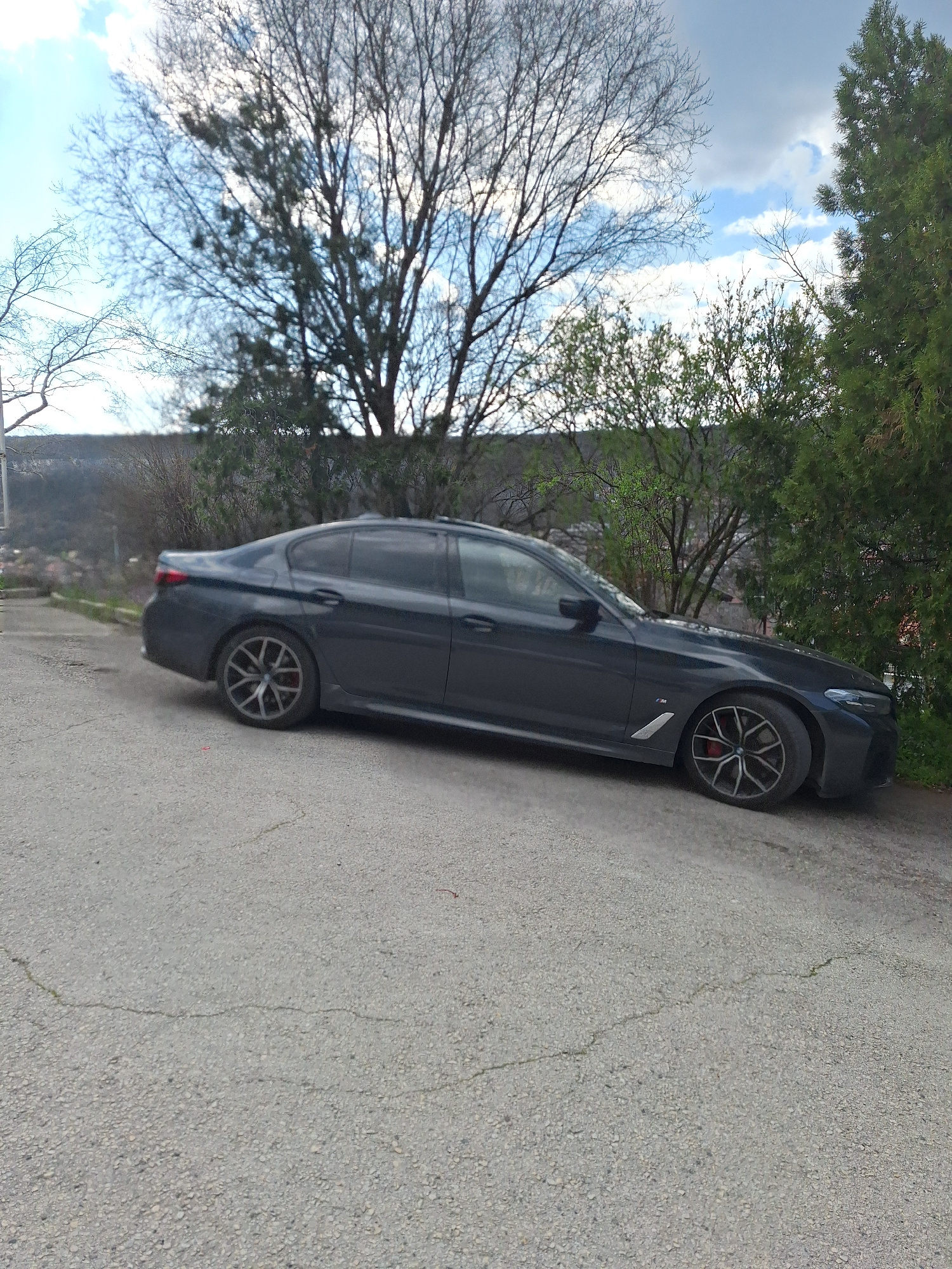 A grey BMW 5 Series sedan is parked on a paved surface. The car is angled slightly towards the right side of the frame. The surrounding environment includes a mix of evergreen and deciduous trees, wit…read more