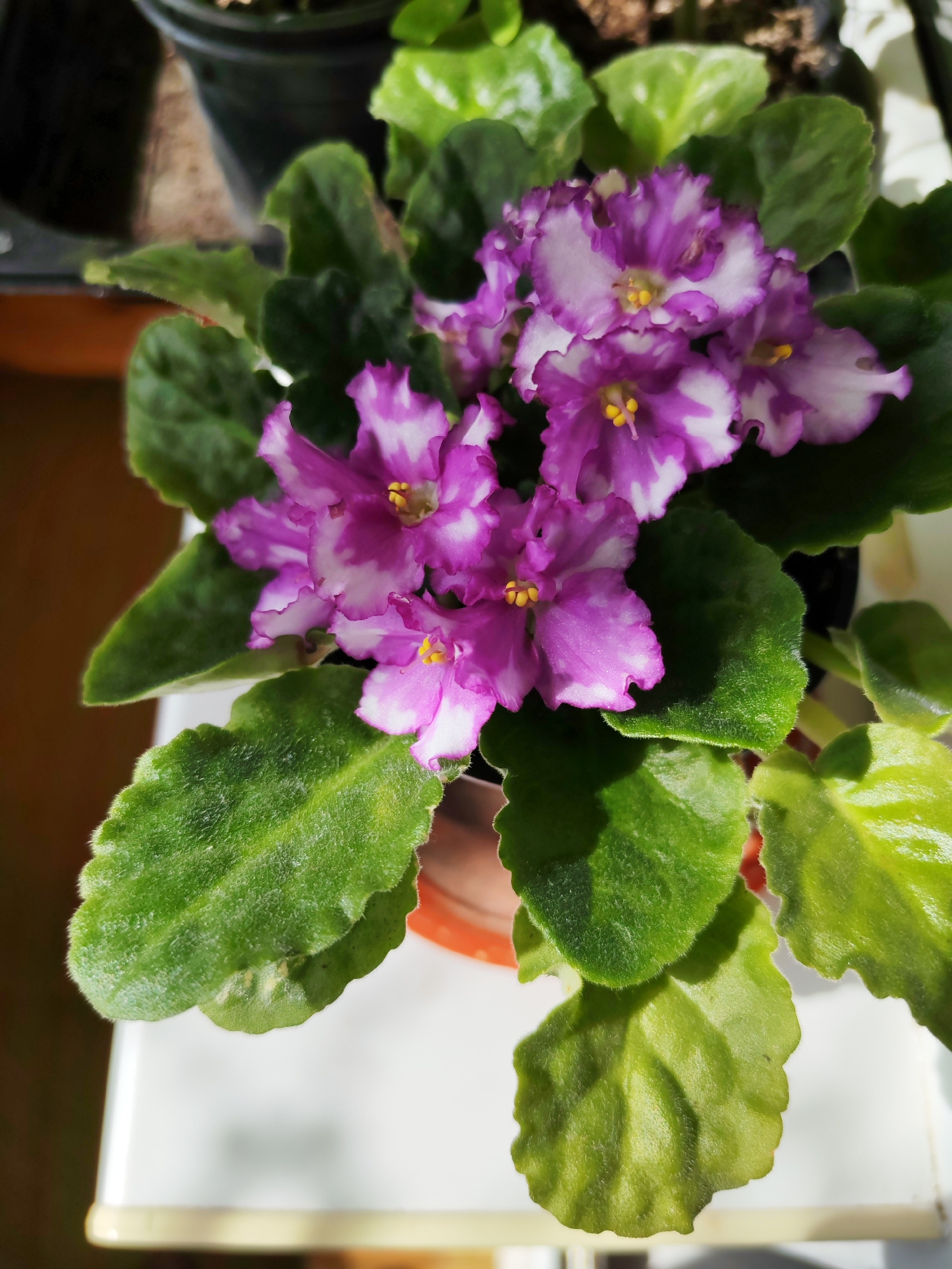 A close-up, high-angle shot depicts an African violet plant in bloom. The plant features ruffled, variegated purple and white flowers with yellow centers. Its dark green, textured leaves are healthy a…read more