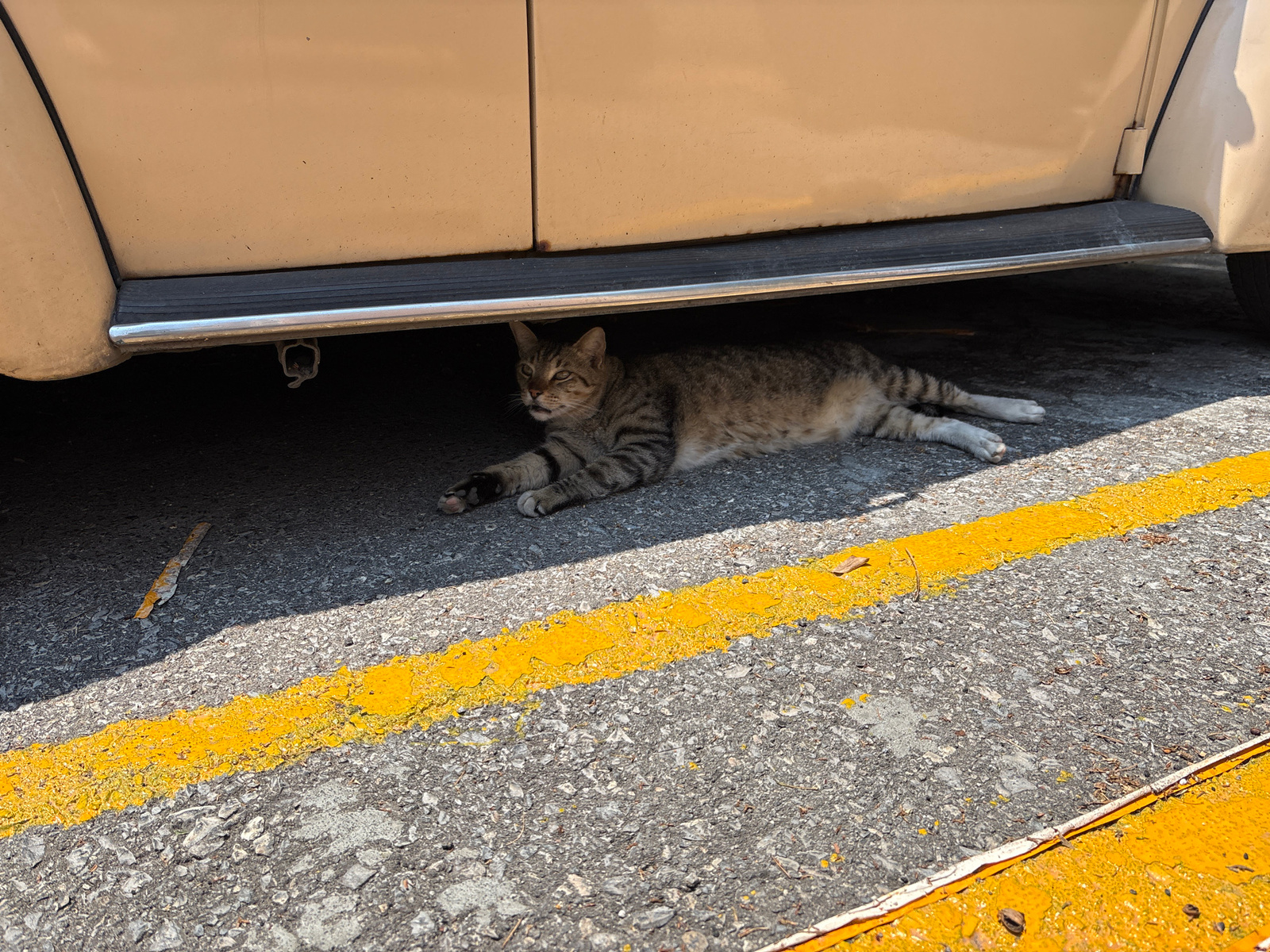 A tan tabby cat lies on its back in the shadow of a vehicle, on asphalt marked with yellow lines, possibly near the city of Cuernavaca, Mexico. The cat's paws are raised. The vehicle is beige with a d…read more