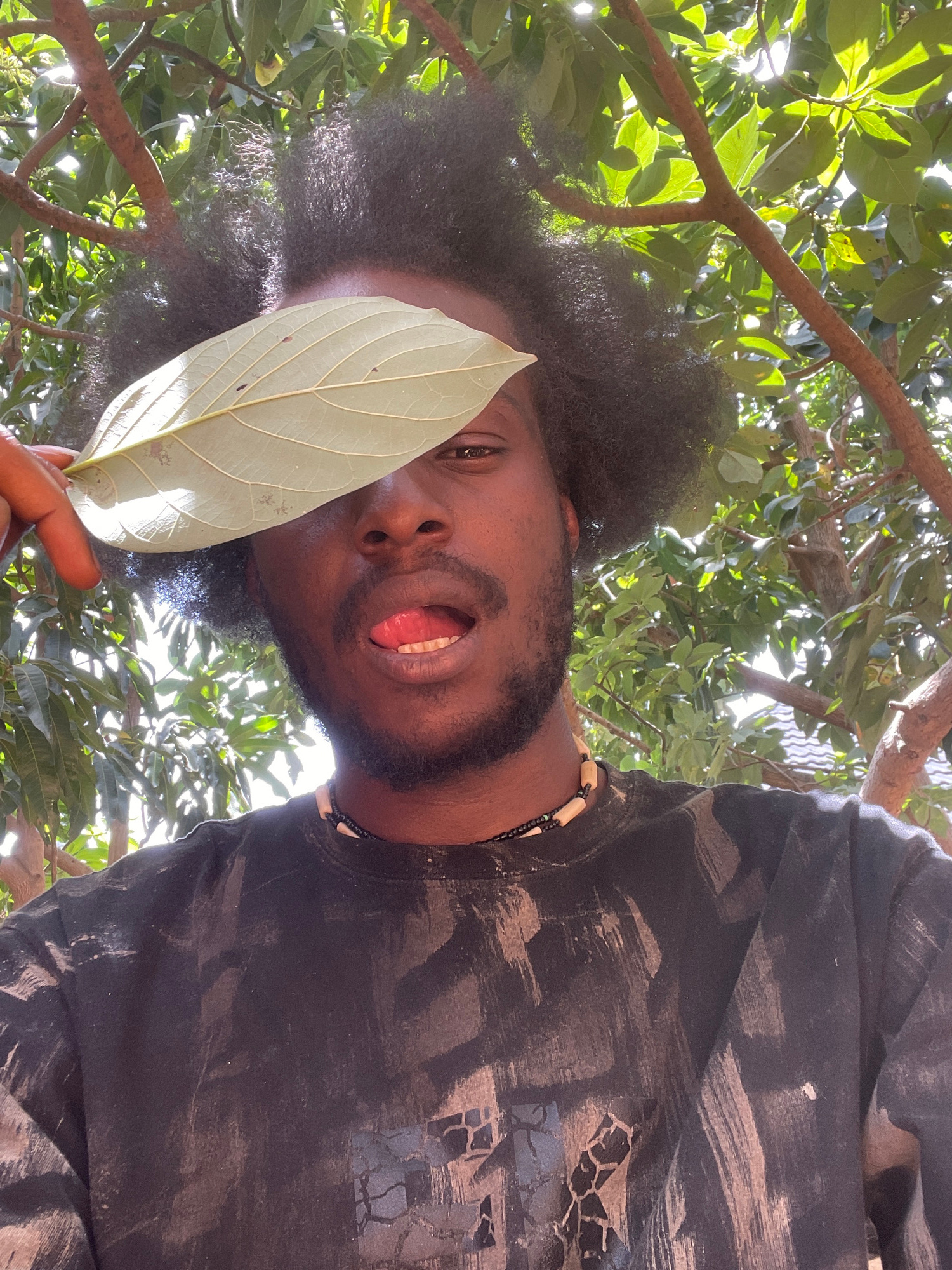 A person with dark skin, an afro hairstyle, and a beard is looking downwards. They are wearing a dark-colored t-shirt and a necklace. A large, light-colored leaf partially obscures their face. The bac…read more