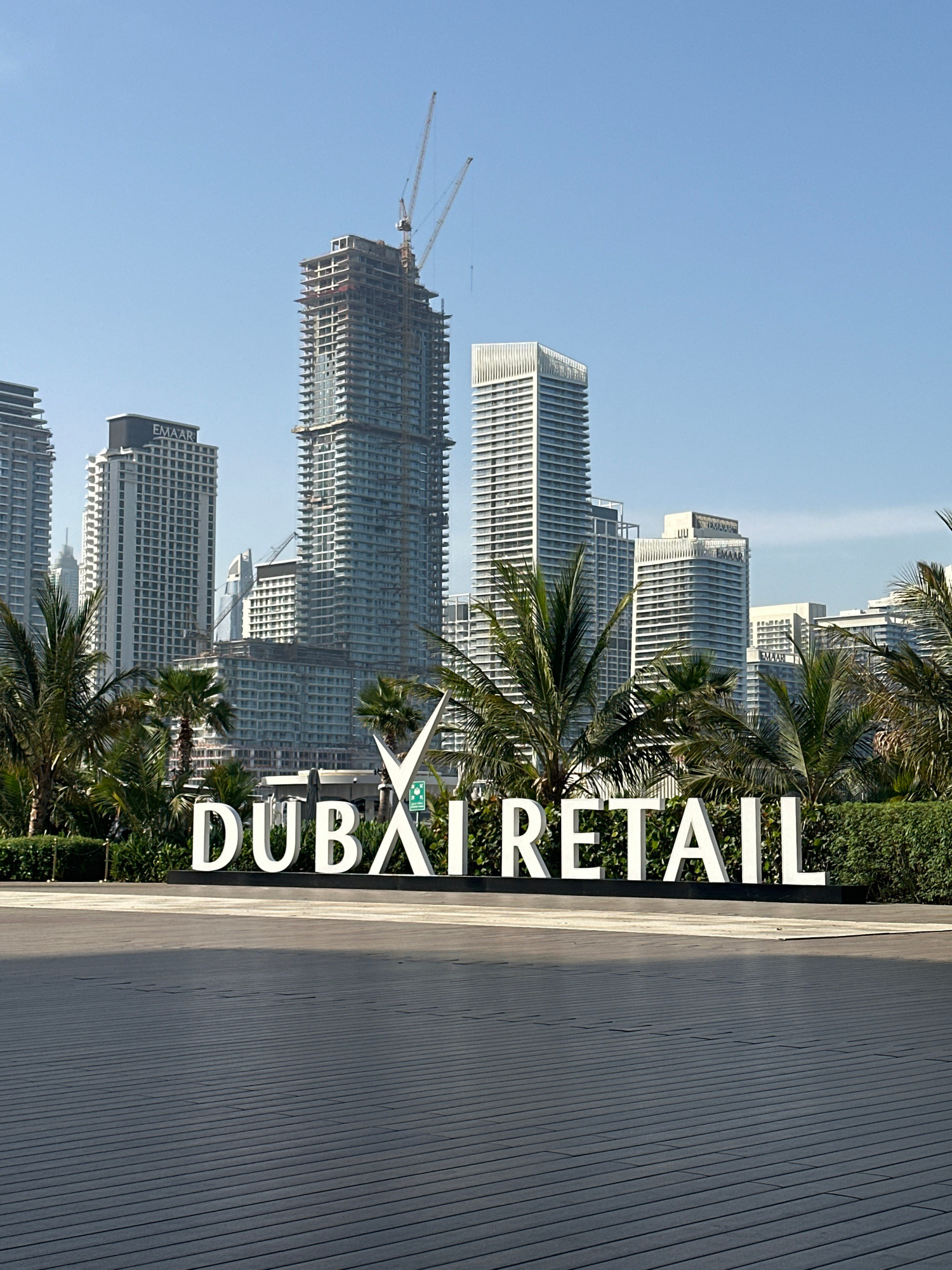 The image, correctly oriented, displays a sunlit urban landscape in Dubai, United Arab Emirates, characterized by modern architecture and lush greenery. In the foreground, a large white sign proudly dā¦read more