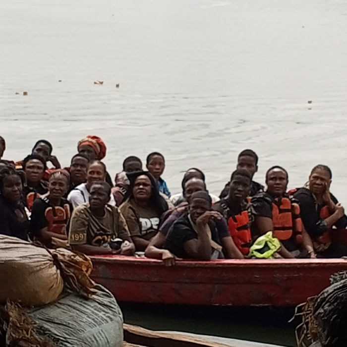 At least 20 to 25 individuals, predominantly adult men and women, are depicted crowded within a red wooden boat on a body of water. Several individuals wear orange life jackets; one wears a green/yell…read more
