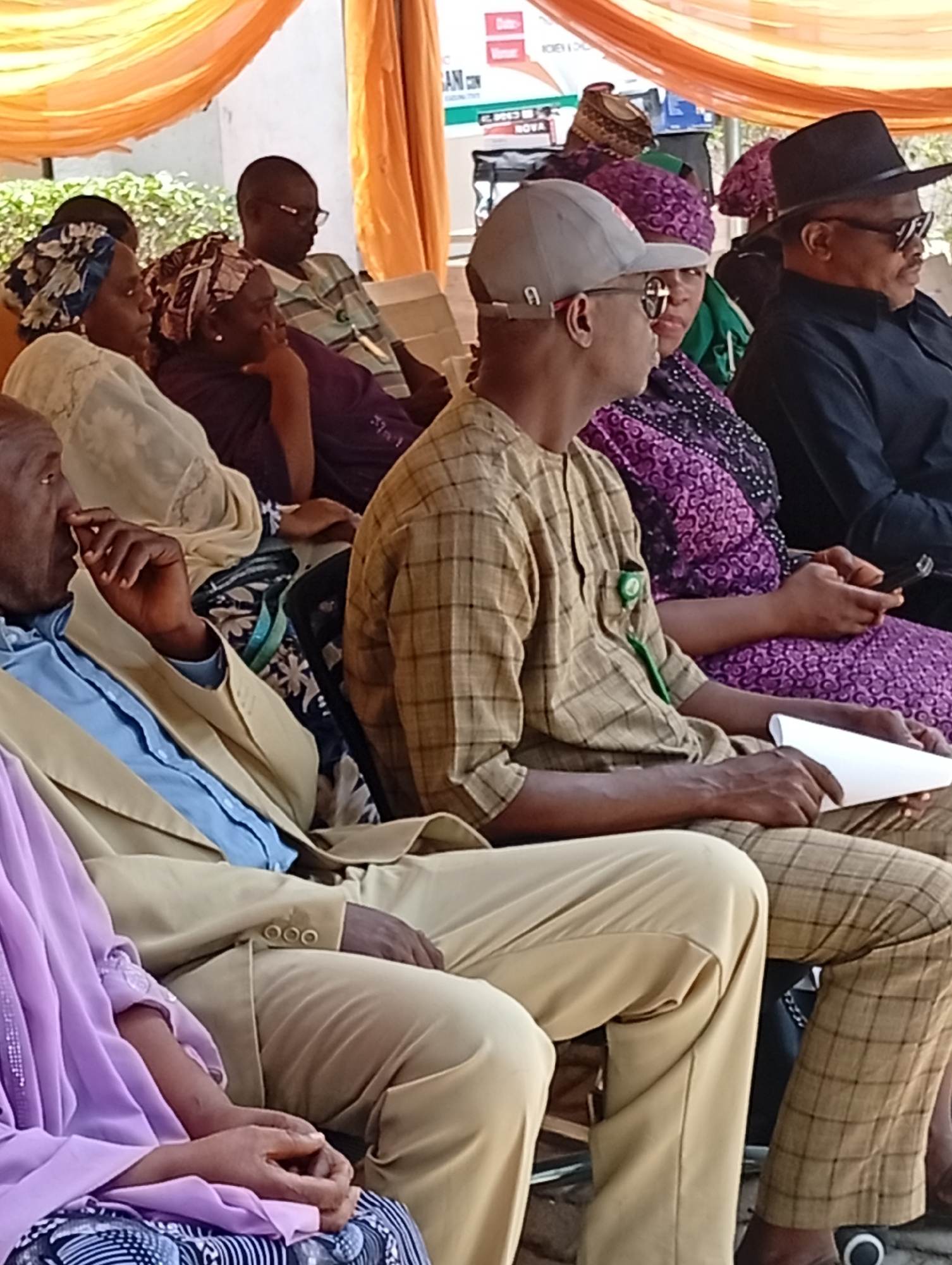 This image depicts a daytime gathering of people, primarily adults, in Unguwar Sarki, Nigeria, likely an outdoor or semi-outdoor event. Bright natural light illuminates the scene, with decorative oran…read more
