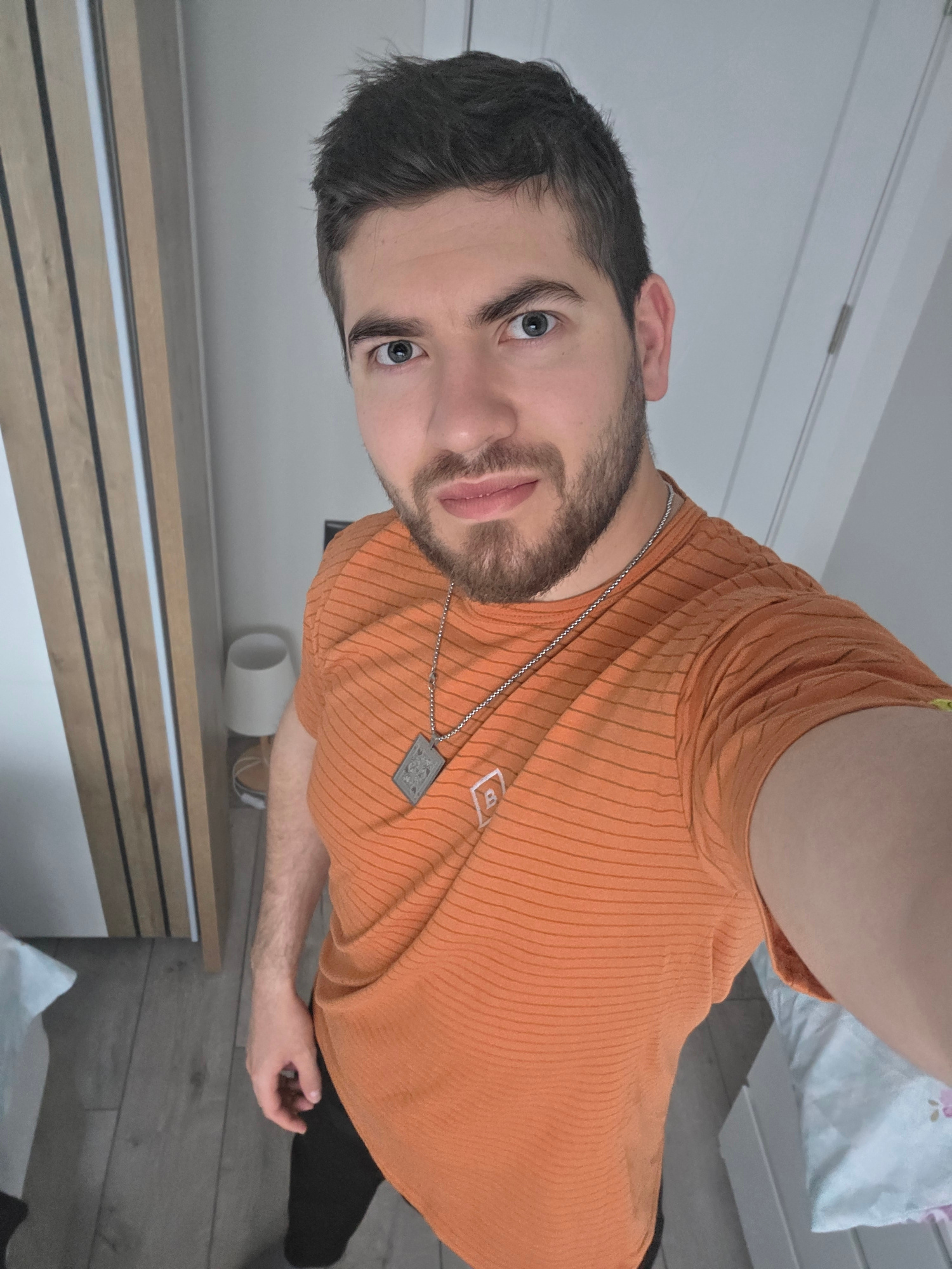 A man with dark hair, a beard, and blue eyes is facing the camera, wearing an orange shirt and a silver chain with a pendant. He is in an indoor setting, with a white and light wood-colored dresser be…read more