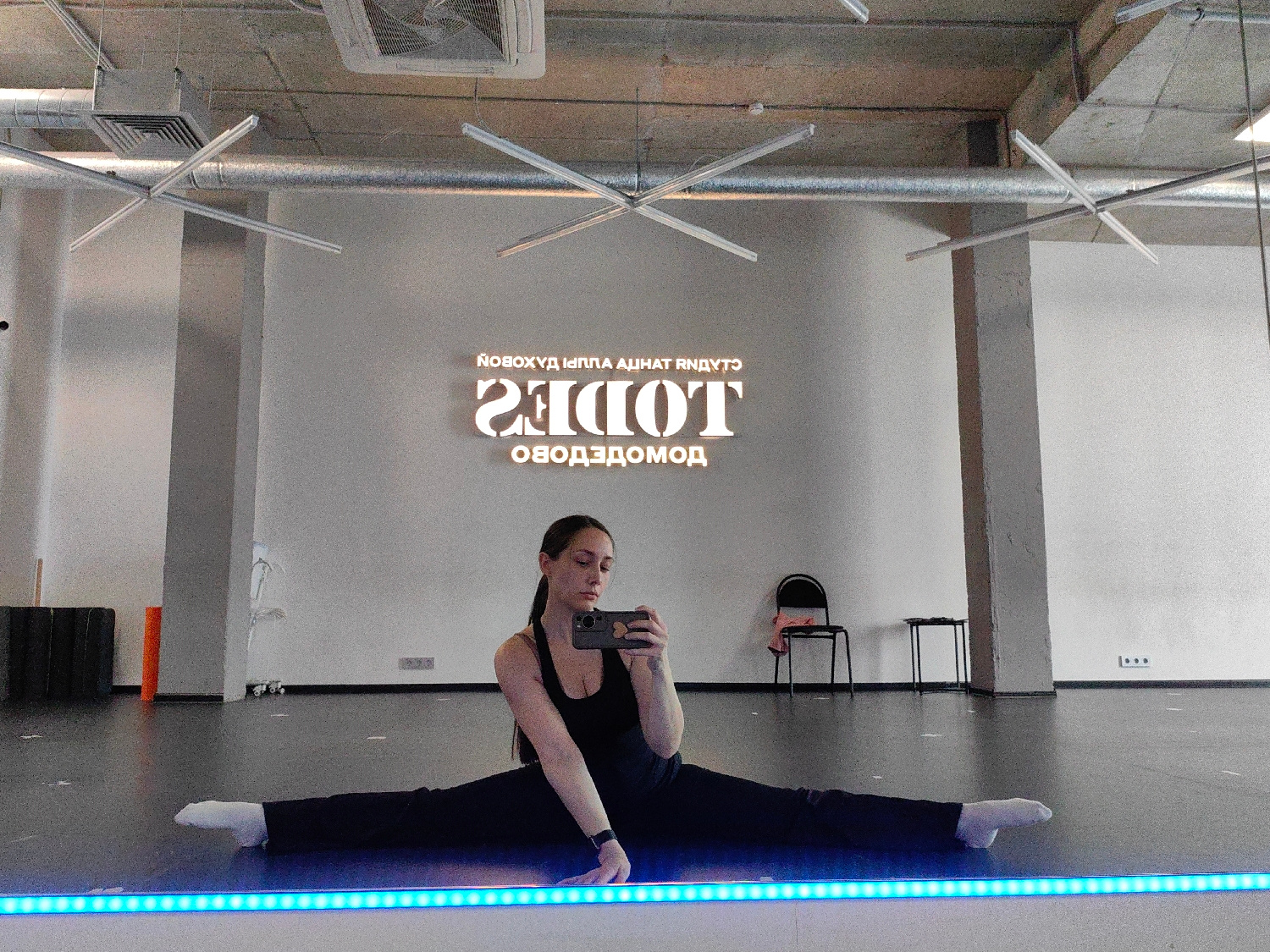 A young woman is captured in a selfie taken in a large mirror, showcasing her flexibility in a full front split. She wears a black top and black pants, with white socks, and holds a smartphone to take…read more