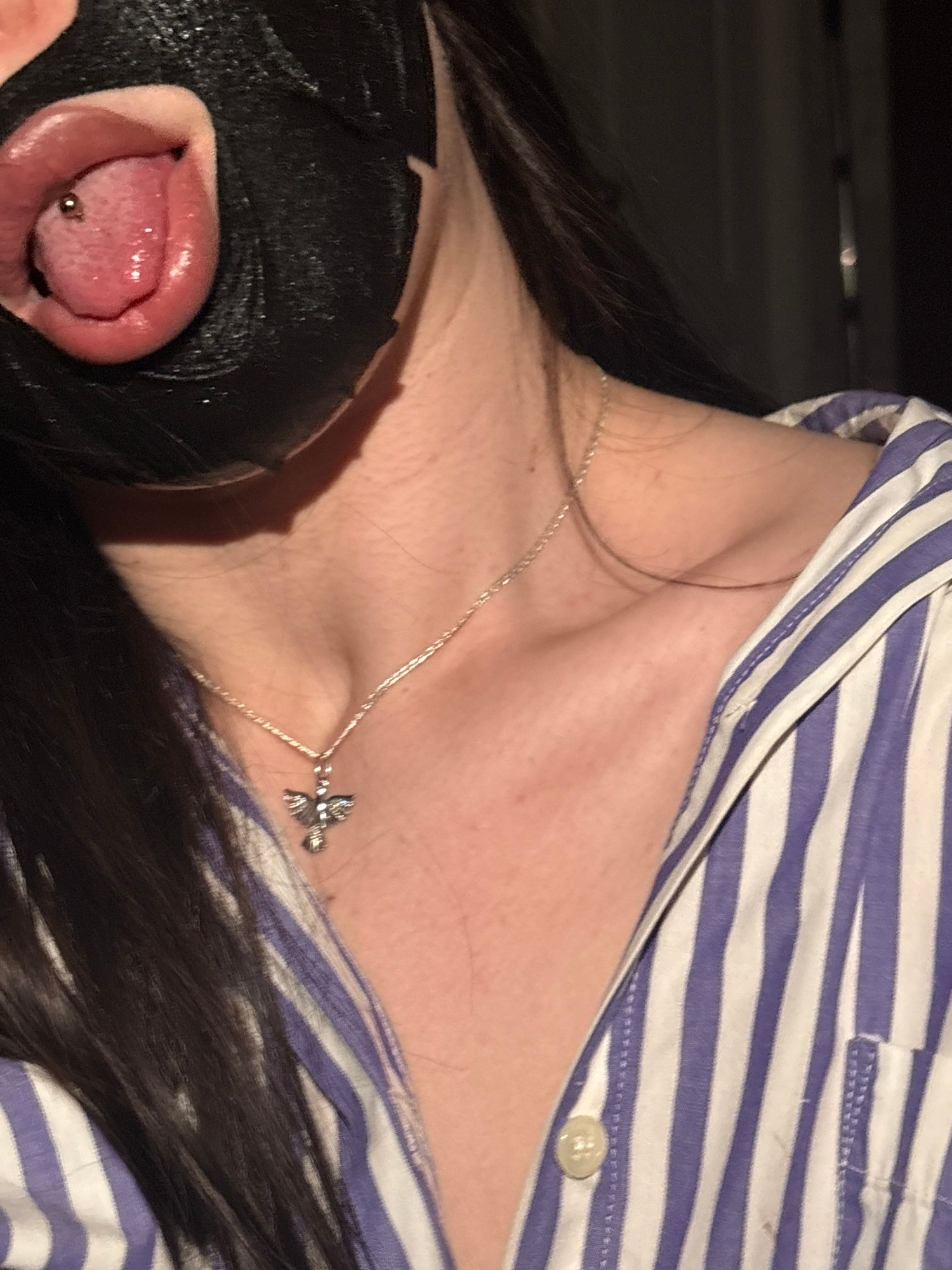 A close-up shot depicts a person wearing a blue and white striped shirt with a button visible. They are also wearing a silver necklace with a bird-shaped pendant. A portion of their face is obscured b…read more