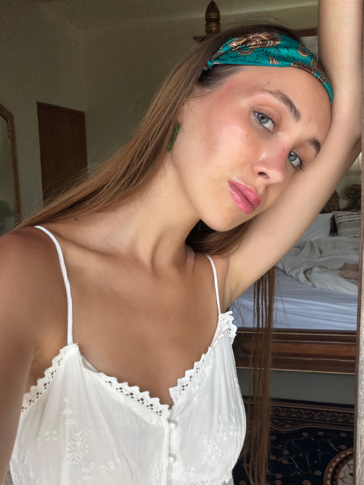 A young woman is the main subject of this tilted close-up shot, likely a selfie, taken in a location that can be tentatively pinpointed as Ubud, Indonesia, based on the inferred background elements. S…read more