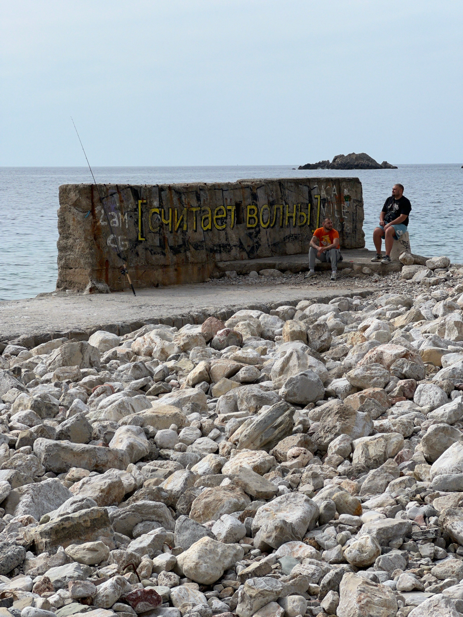The image depicts a coastal scene at Perazića Do, Montenegro. The foreground is dominated by a large pile of gray rocks, providing a textured landscape. A concrete structure extends from the foregroun…read more