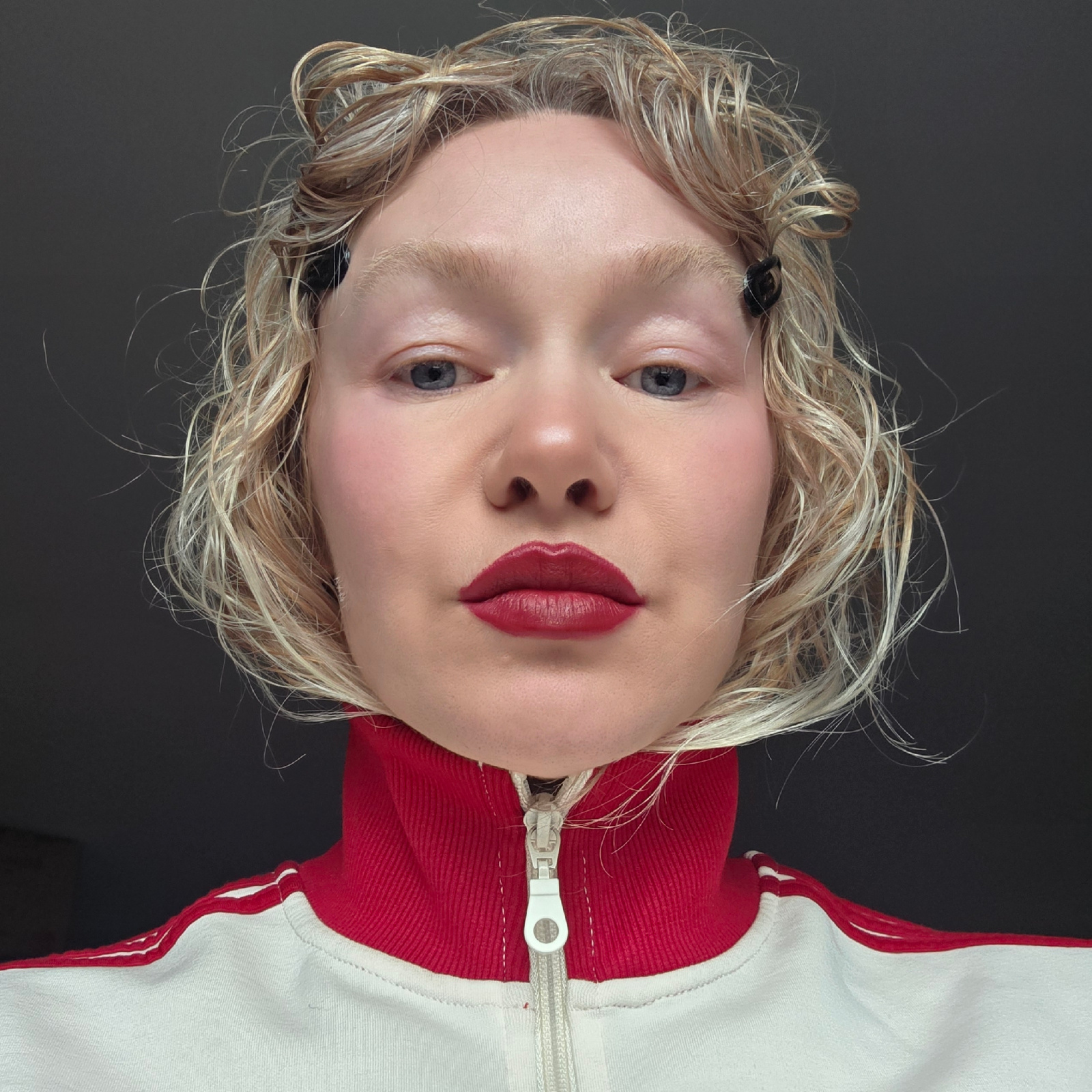 This close-up portrait features a young individual with fair skin, light blonde or strawberry blonde curly hair, and light blue eyes. The person's face is positioned at an angle, with a neutral and ca…read more