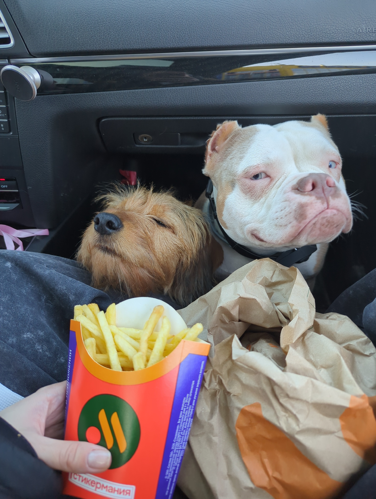 Inside a vehicle, specifically the passenger side, in Golikovo, Russia, a human hand holds a red, orange, and green fast-food carton filled with french fries, displaying a logo resembling Vkusno i Toc…read more