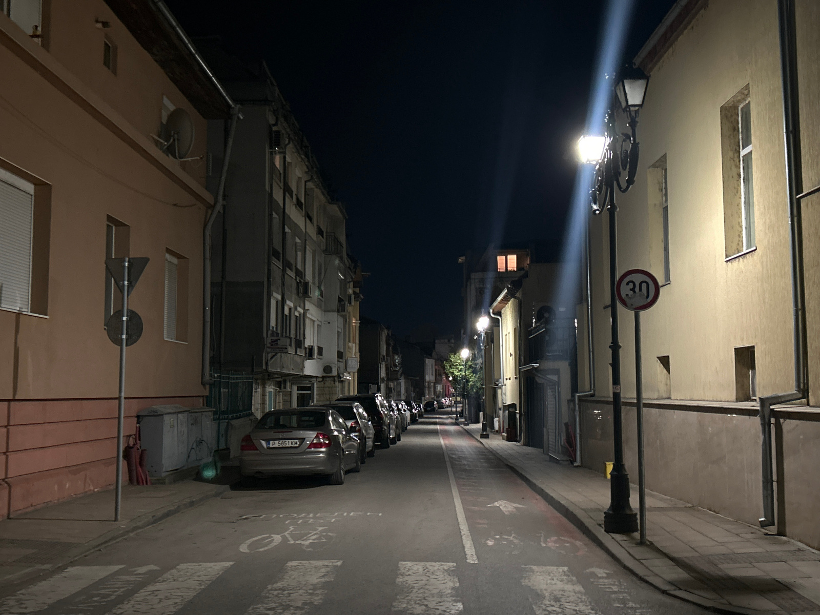 A night scene depicts a narrow urban street in Ruse, Bulgaria, extending into the distance under a dark, clear sky. The street is flanked by multi-story residential or mixed-use buildings on both side…read more