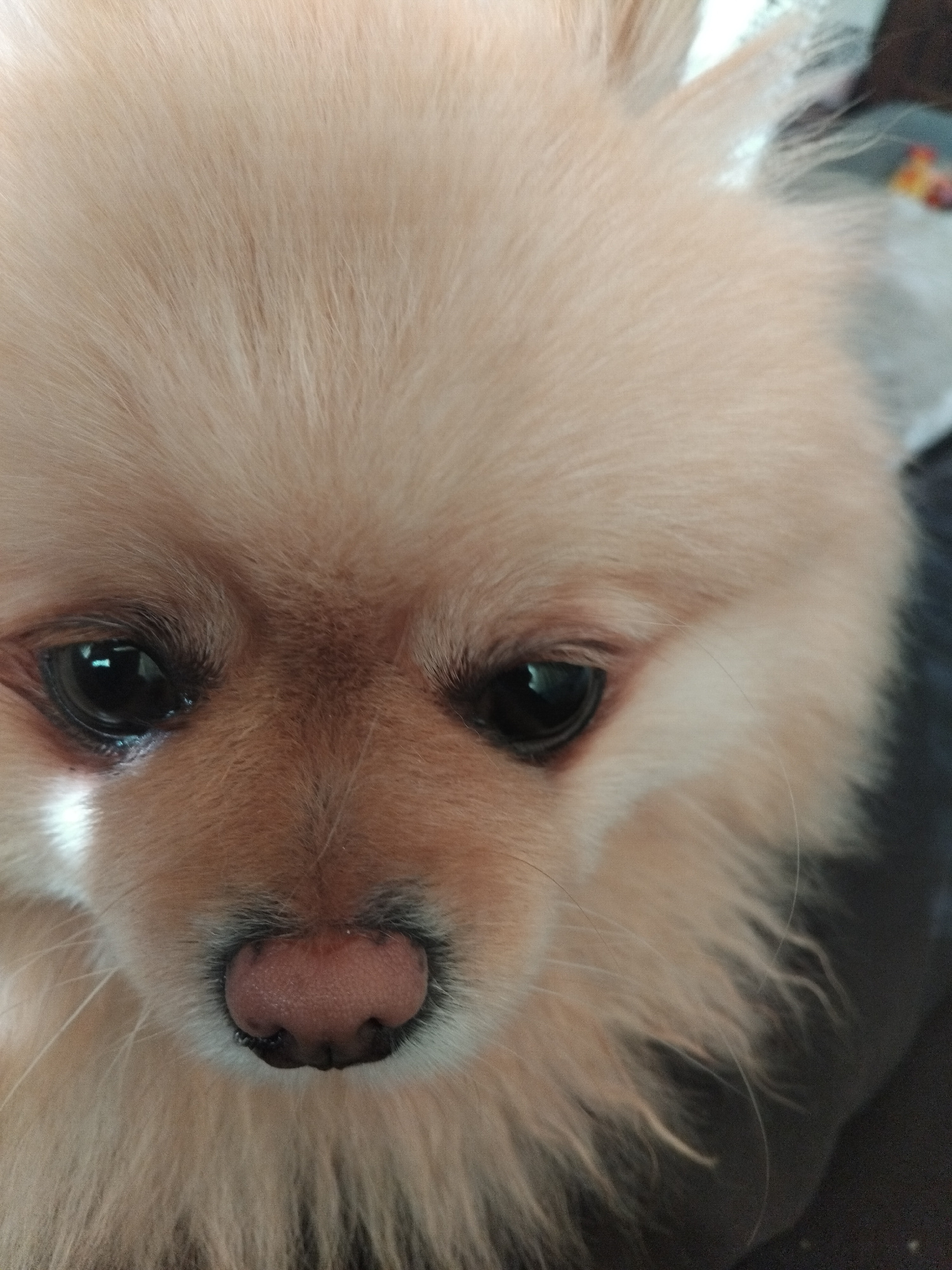 A close-up photograph of a light-colored Pomeranian dog. The dog's face fills the frame, with its dark eyes and pink nose prominently featured. The surrounding fur is soft and fluffy. The location, Ap…read more