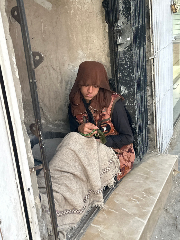A single individual is seated in an urban alcove in Quetta City Tehsil, Pakistan. The person, appearing young, wears a loose brown head covering, a black long-sleeved shirt, and a brown and beige camo…read more