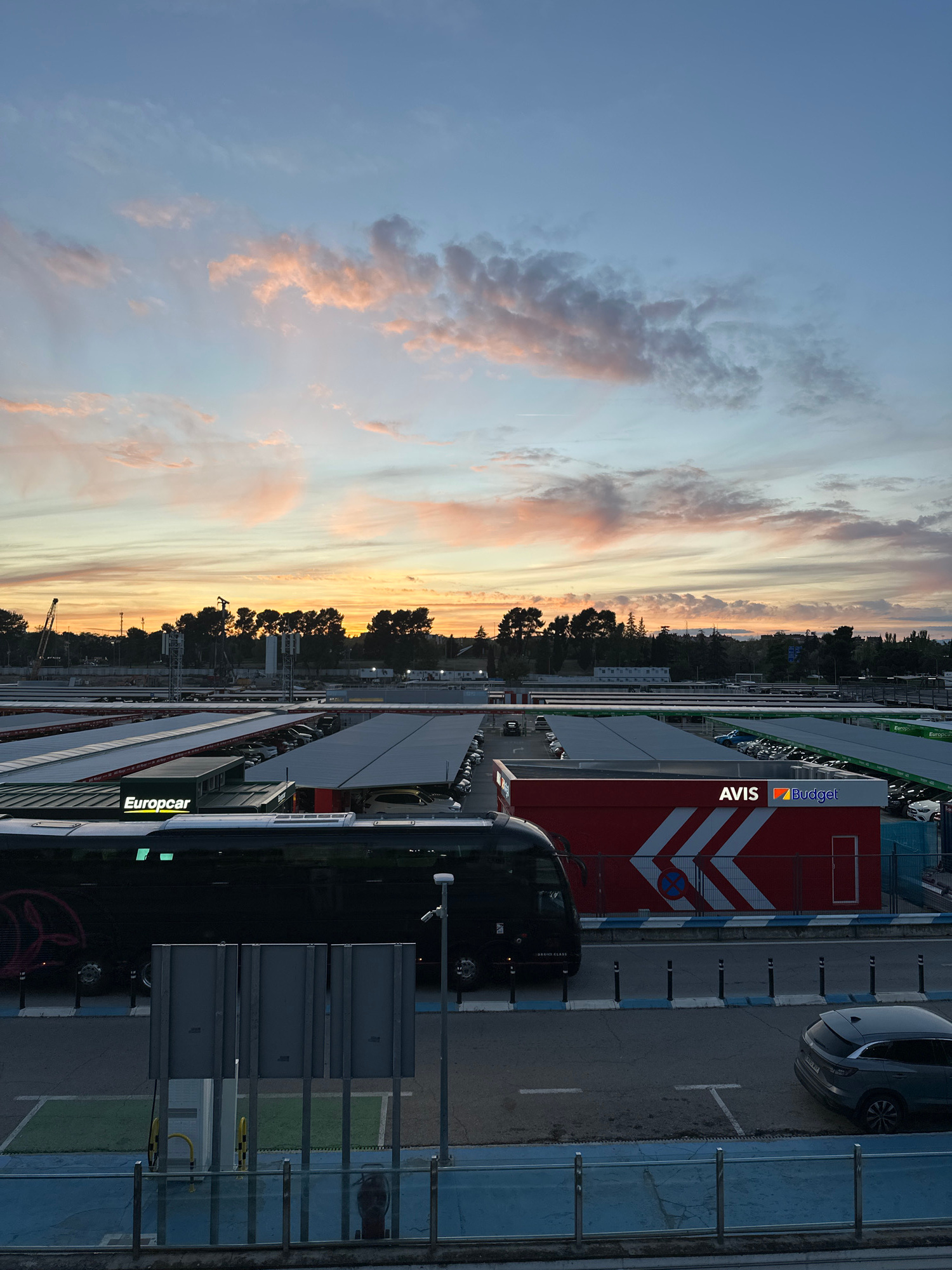 The image shows a view of the car rental area at Madrid Airport (MAD) in Spain during sunset. The Avis/Budget rental car facility is visible on the right, and a "Europcar" branded bus is parked on the…read more