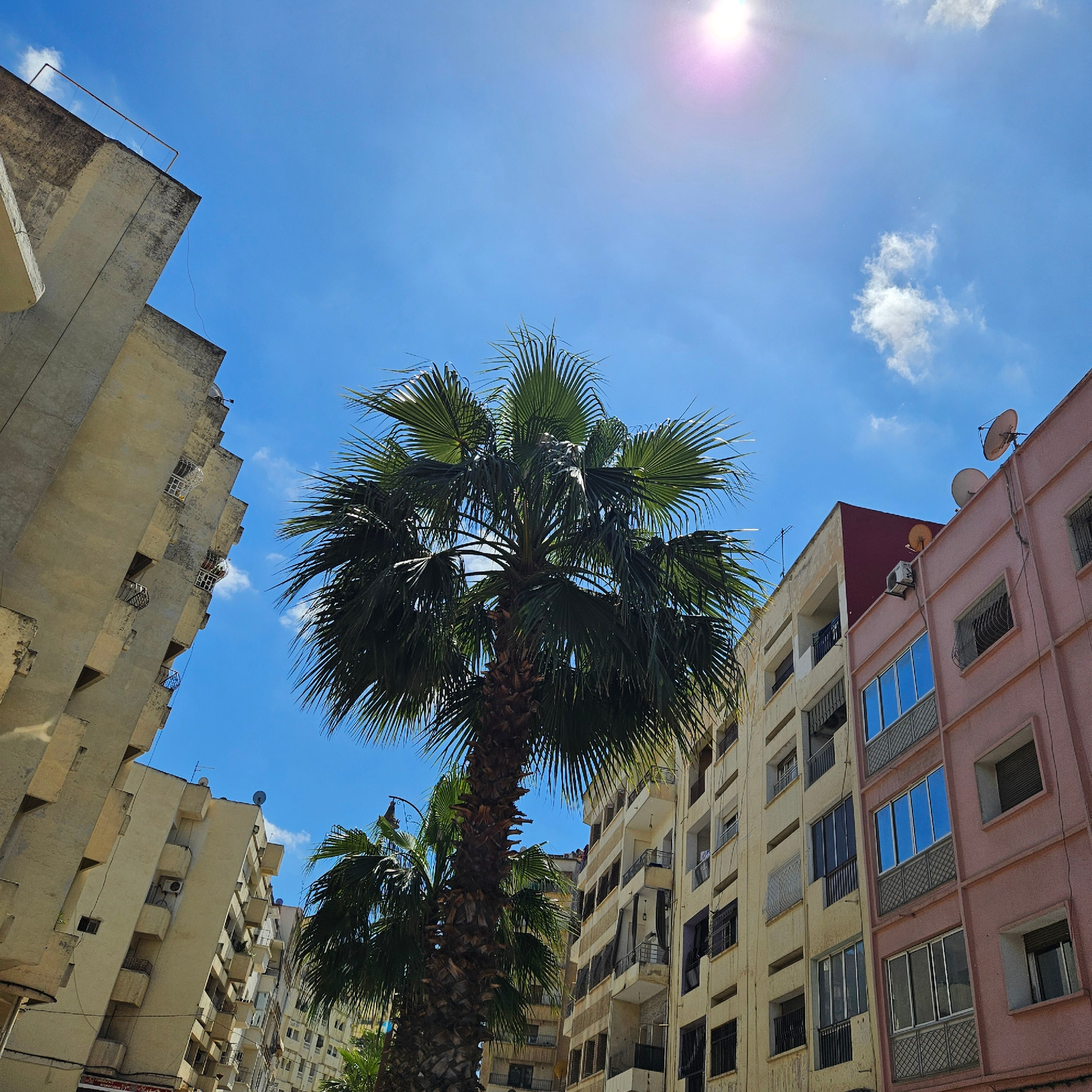 The image is a low-angle shot looking up at palm trees situated between buildings in the city of Fez, Morocco. The sky is blue with scattered clouds. The buildings are multi-story with varying architectural styles, including a pink building with satellite dishes and a stepped, light-colored building. The palm trees are in the center of the frame, their fronds extending out against the sky. The sun is visible in the upper left corner. | Open Wire