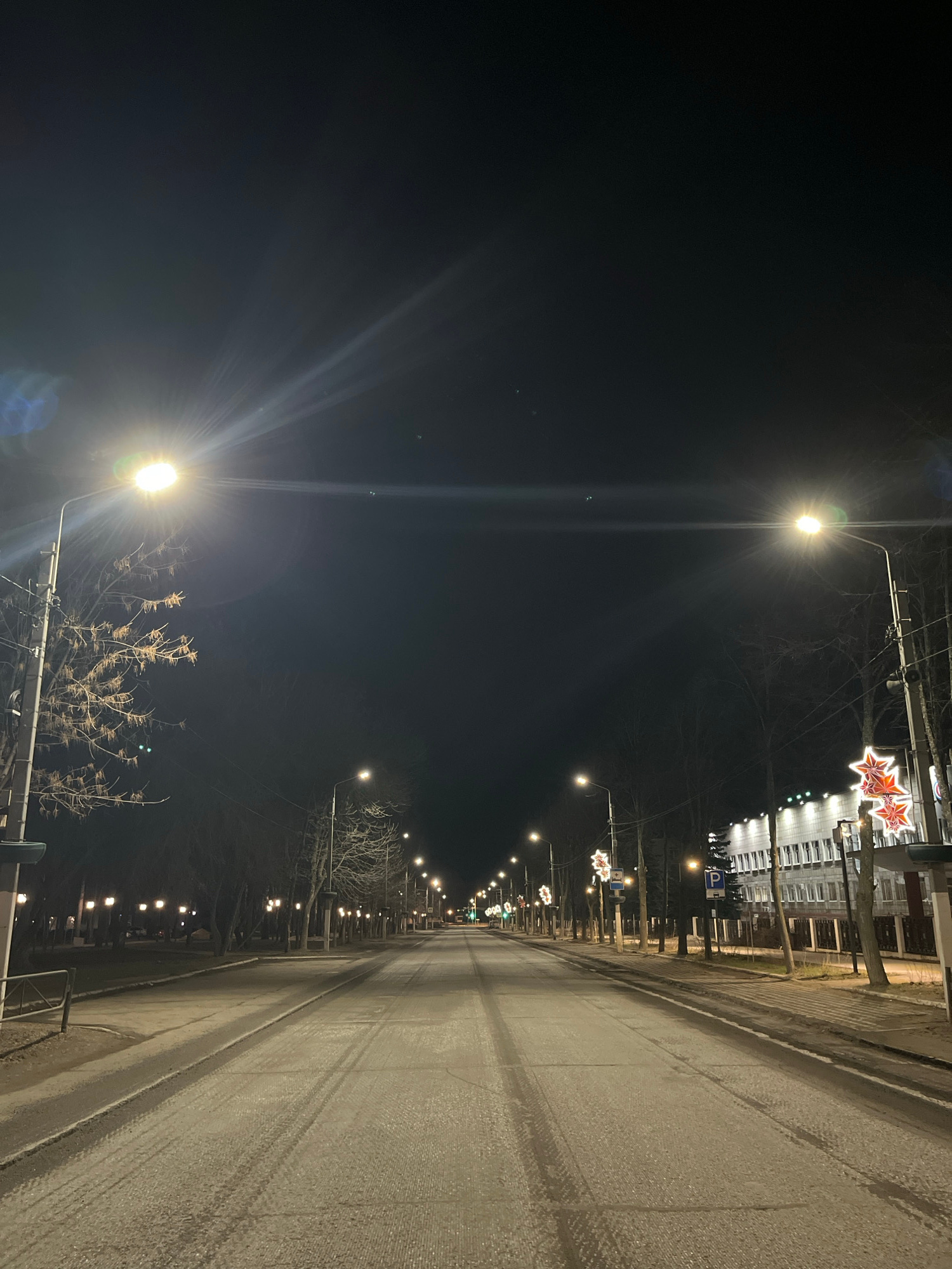 The image depicts a street scene at night in Chaikovsky, Russia. The street is illuminated by streetlights lining both sides, spaced evenly apart. Some of the lights feature red star-shaped decoration…read more