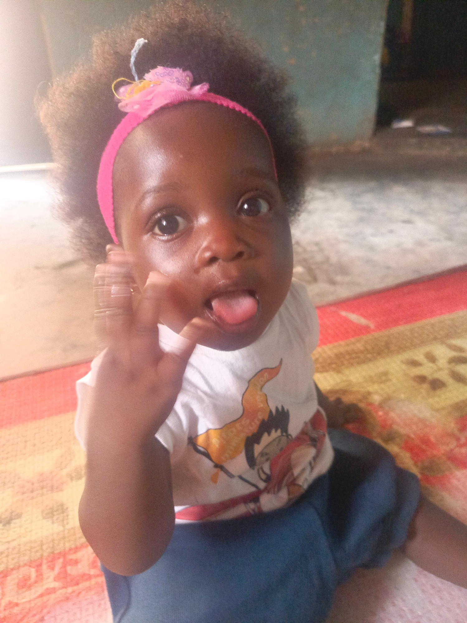 A low-angle, close-up shot depicts a young child sitting on a patterned surface. The child, with dark skin and curly hair adorned with a pink headband, sticks out their tongue while holding up their l…read more