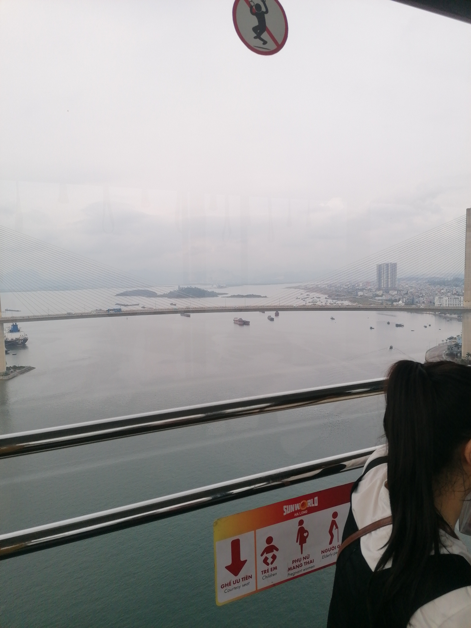 The image shows a view from inside what appears to be a cable car in Hong Gai Ward, Vietnam. Outside, a bridge spans a body of water, connecting landmasses on either side. Buildings and other infrast…read more