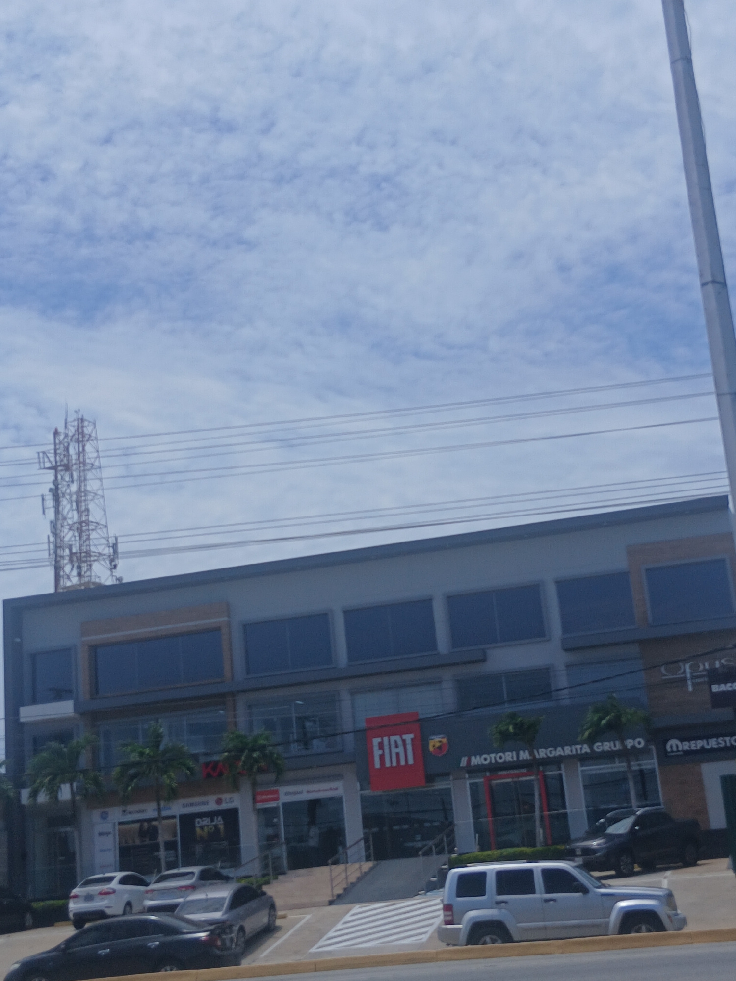 The image shows a partly cloudy sky above a building in Los Robles, Venezuela. The building appears to be a car dealership, with signs for "Fiat" and "Motori Margarita Grupo." Several cars are parked…read more