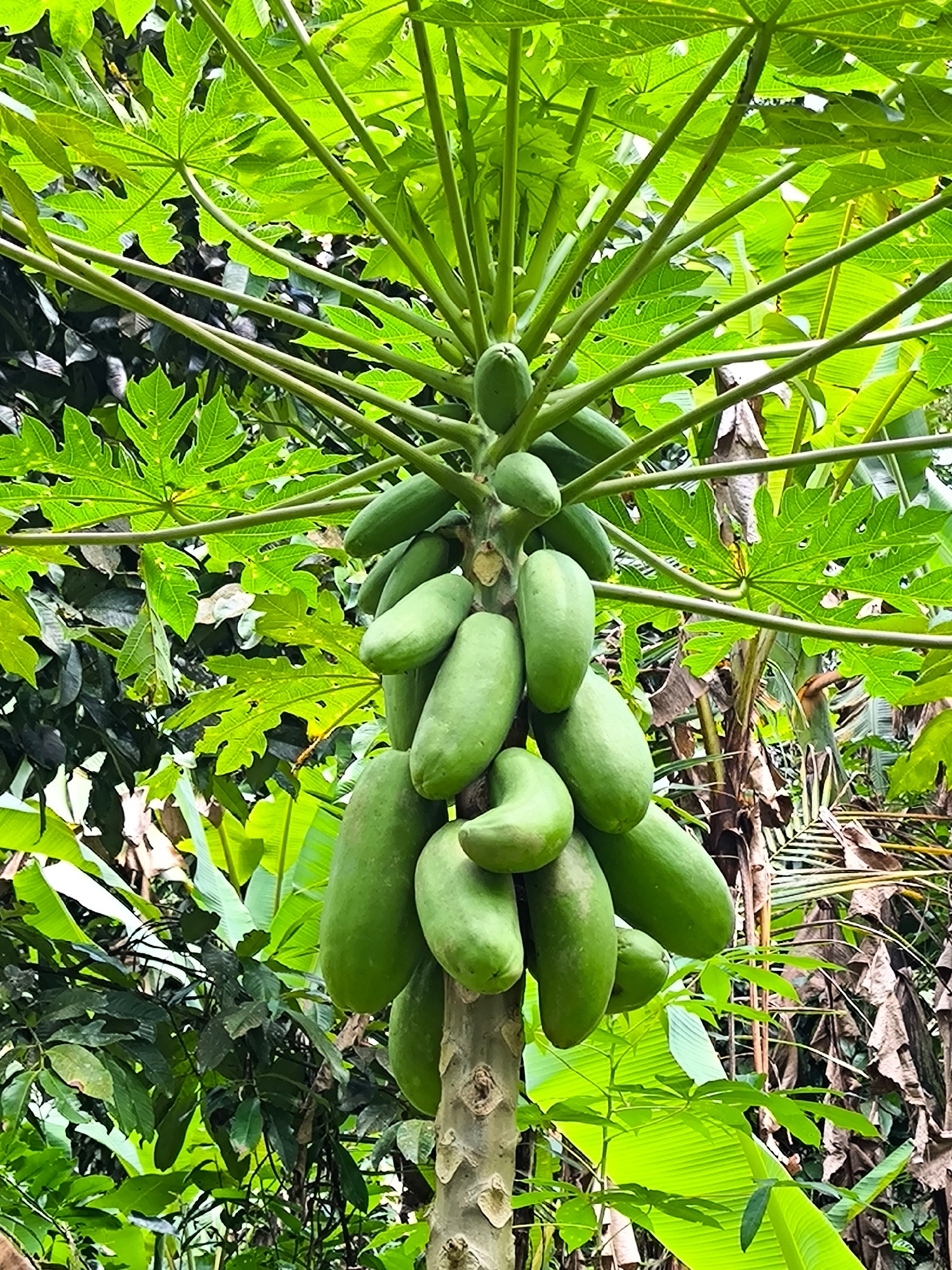 This image depicts a papaya tree laden with unripe green papayas, likely located in Mekarsari, Indonesia given the prompt. The tree has a thick, textured trunk and a cluster of papayas growing densely…read more