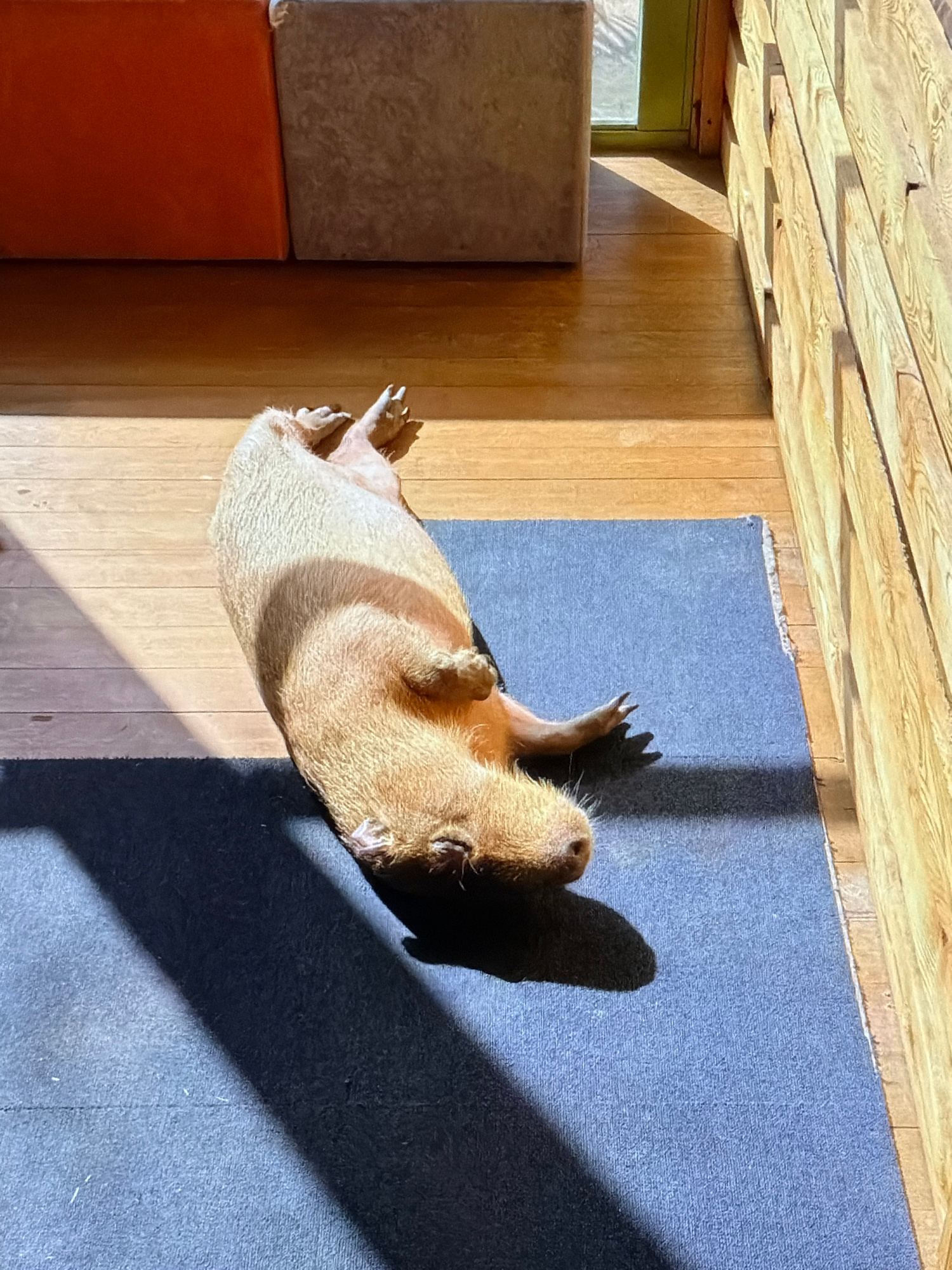 A capybara lies on its back on a blue rug. The rug sits on a wooden floor, next to a wooden wall. Light and shadow interplay across the scene. A window is visible in the corner. Two blocks, one grey a…read more