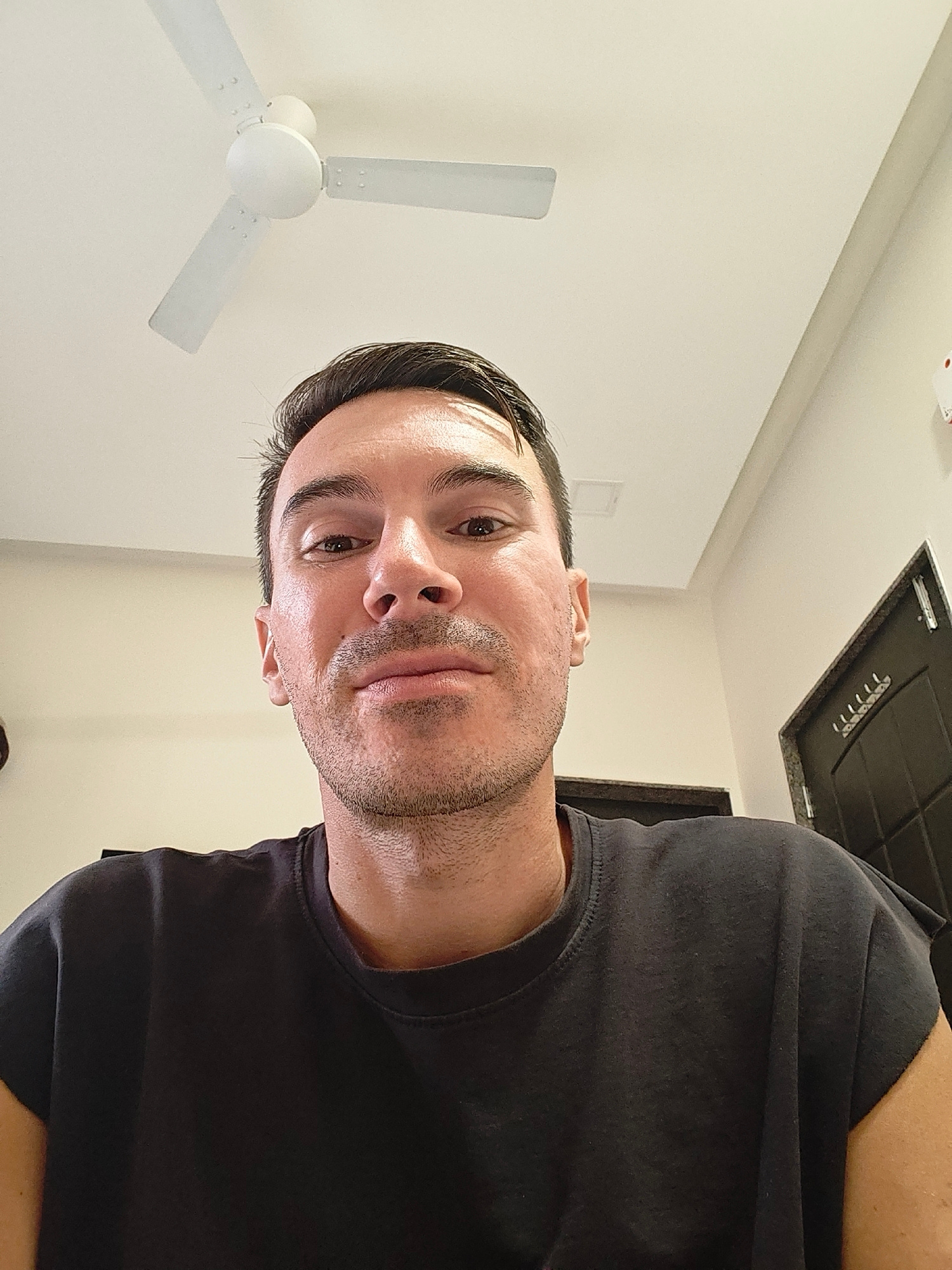 The image displays a head-and-shoulders selfie of a male individual, estimated to be between 25 and 45 years old, with short dark hair, a light complexion, and short stubble on his face. He is wearing…read more