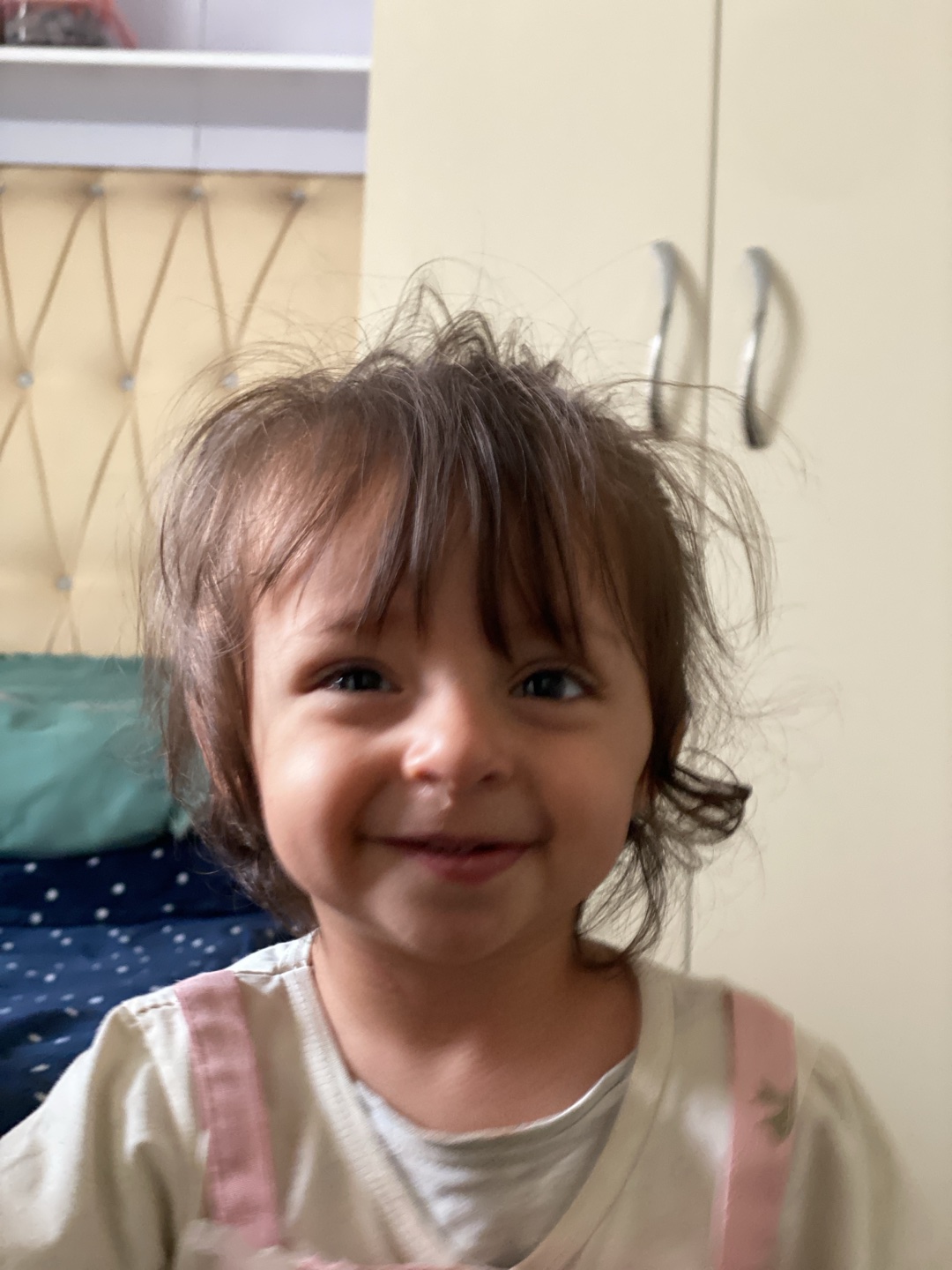 A young child with brown hair and dark eyes smiles at the camera. The child wears a light-colored shirt with pink straps. The background features a headboard upholstered in light-colored material with…read more