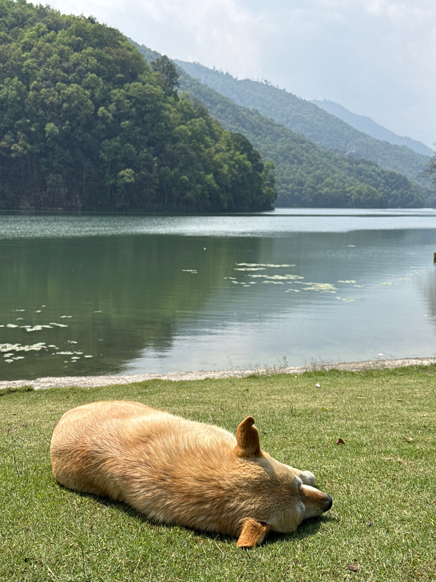 A horizontal medium shot depicts a tan dog lying on green grass beside a lake in Pokhara, Nepal. In the background, green mountains rise towards a hazy sky. The lake's surface reflects light and exhib…read more