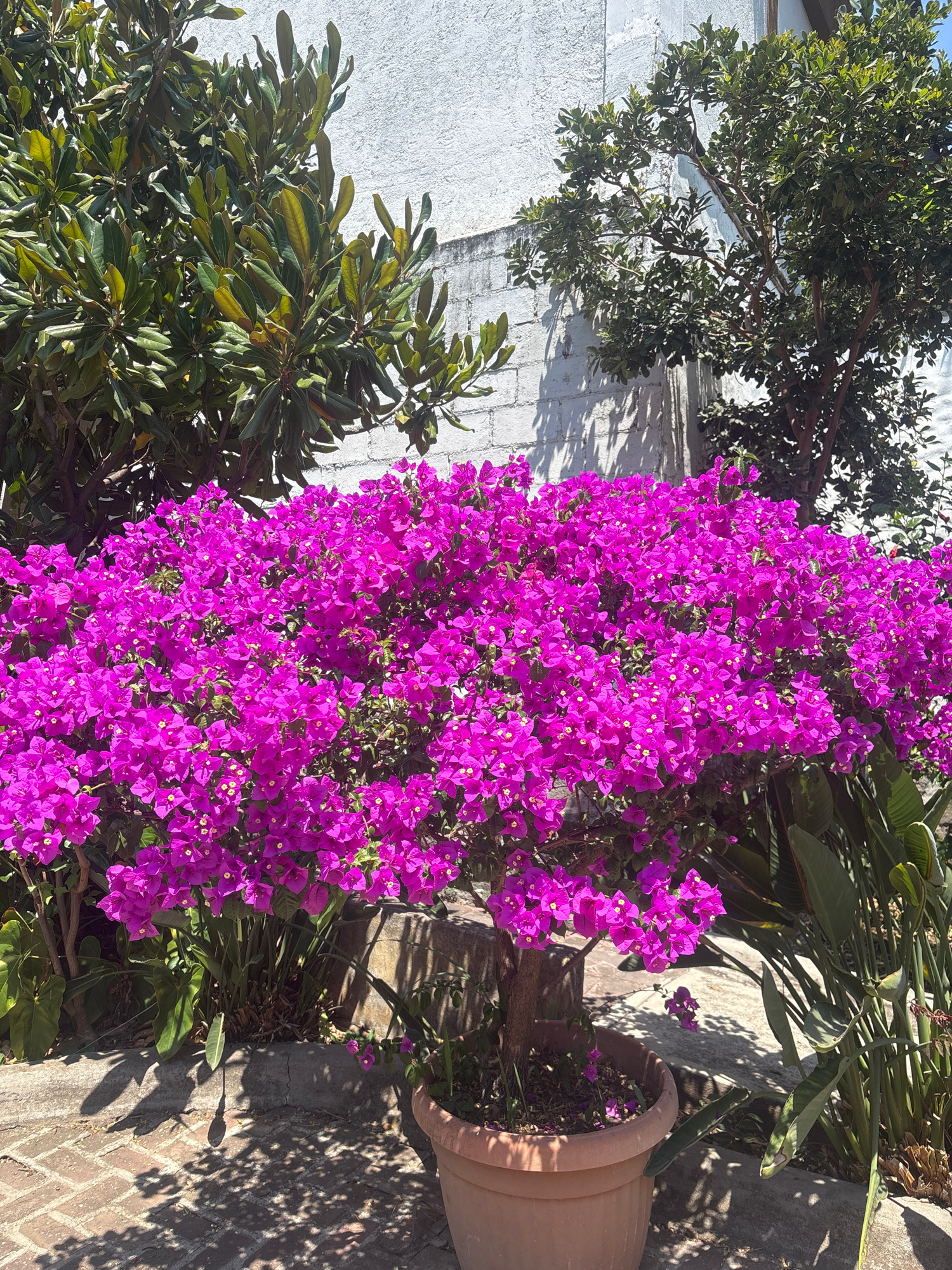 The image shows a lush bougainvillea bush, densely covered in vibrant purple flowers, positioned in a garden setting. A terra cotta pot sits nearby on a paved surface, possibly brick or stone, patternβ¦read more