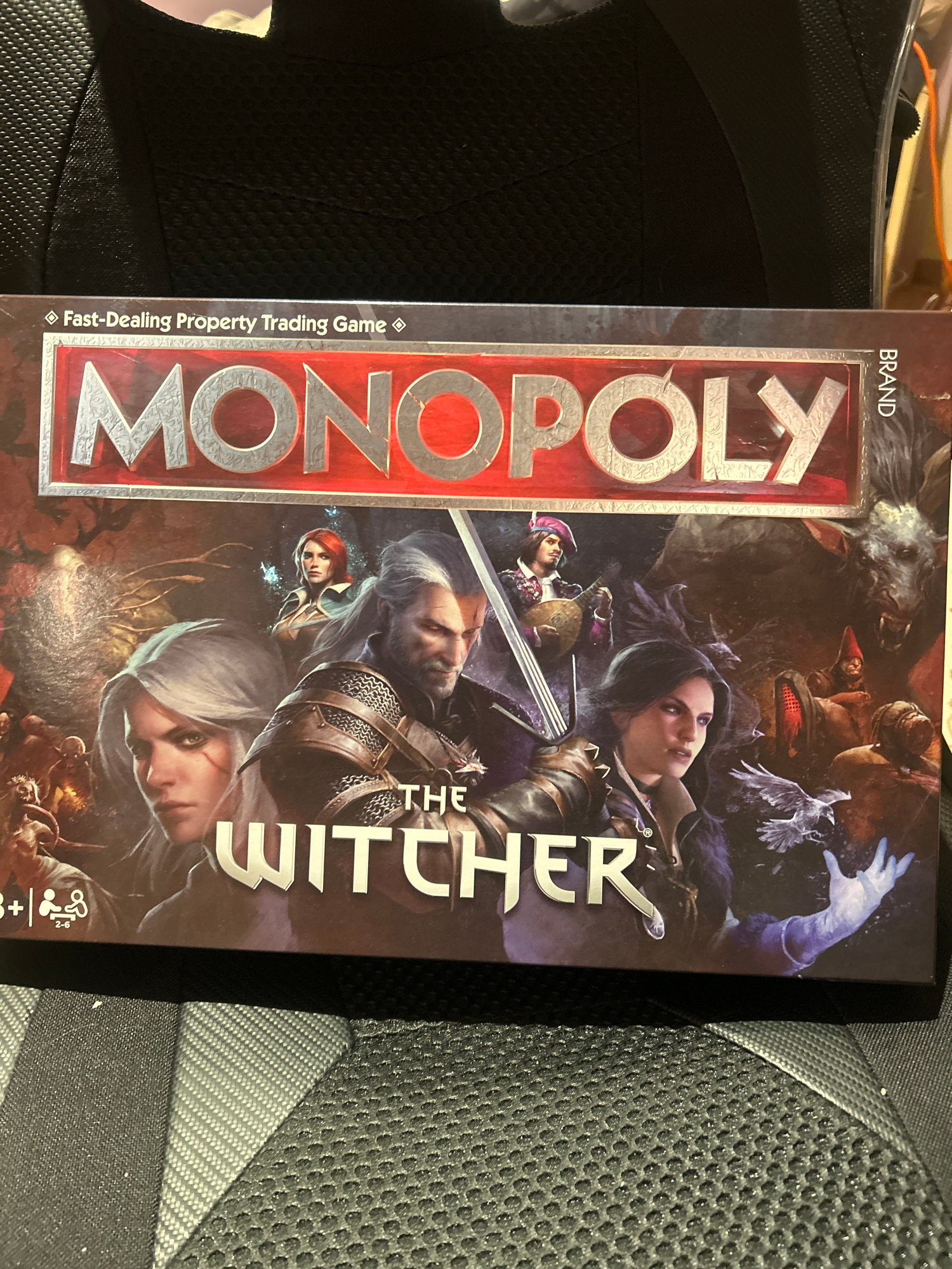 The image shows a board game, specifically a "Monopoly: The Witcher" edition. The box is mostly maroon with "Monopoly" written vertically in large, silver-edged letters. The box depicts characters and…read more
