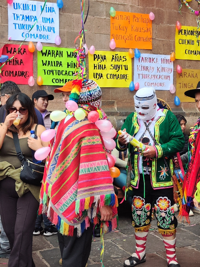 The image captures a vibrant street scene in Cusco, Peru, likely during a festival. Costumed individuals are prominent, one wearing a colorful poncho and balloons, another in a mask with elaborate greβ¦read more