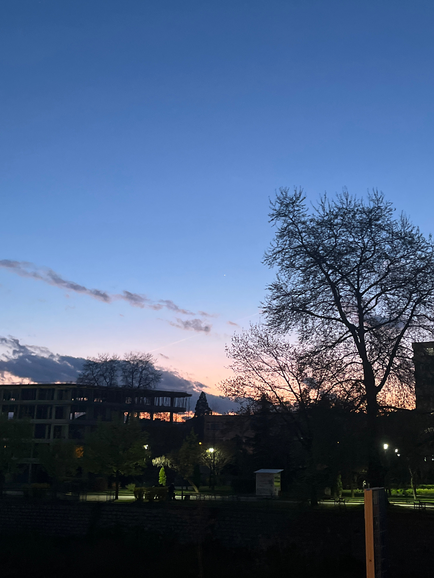 The image shows a cityscape at dusk. The sky is a gradient of blue to orange-pink near the horizon, with scattered clouds and contrails visible. Silhouetted trees are prominent in the foreground. In t…read more