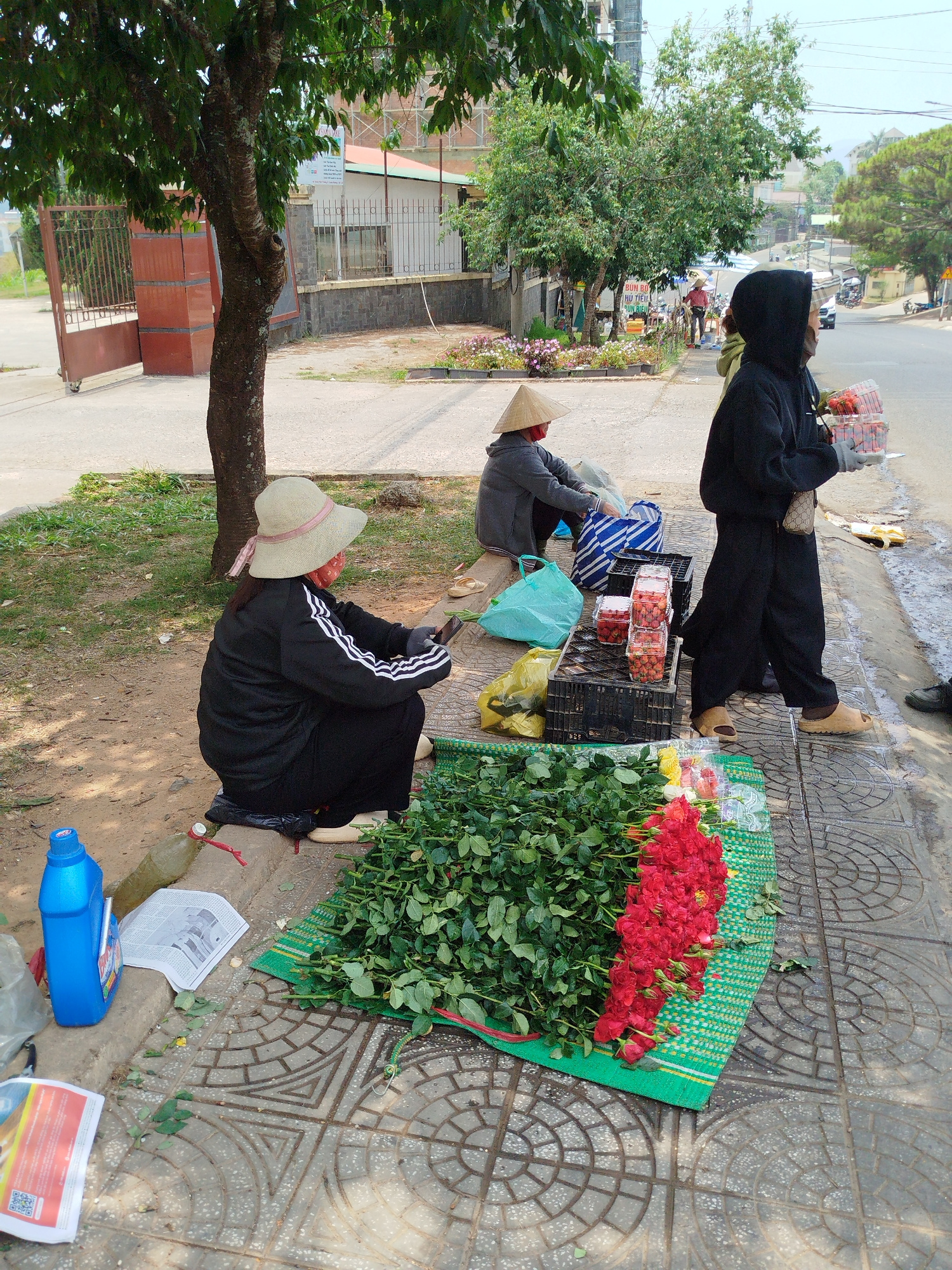The image depicts a street scene in Da Lat, Vietnam, with several individuals engaged in commerce. In the foreground, a woman wearing a sun hat, a black tracksuit, and a red face mask is squatting nex…read more