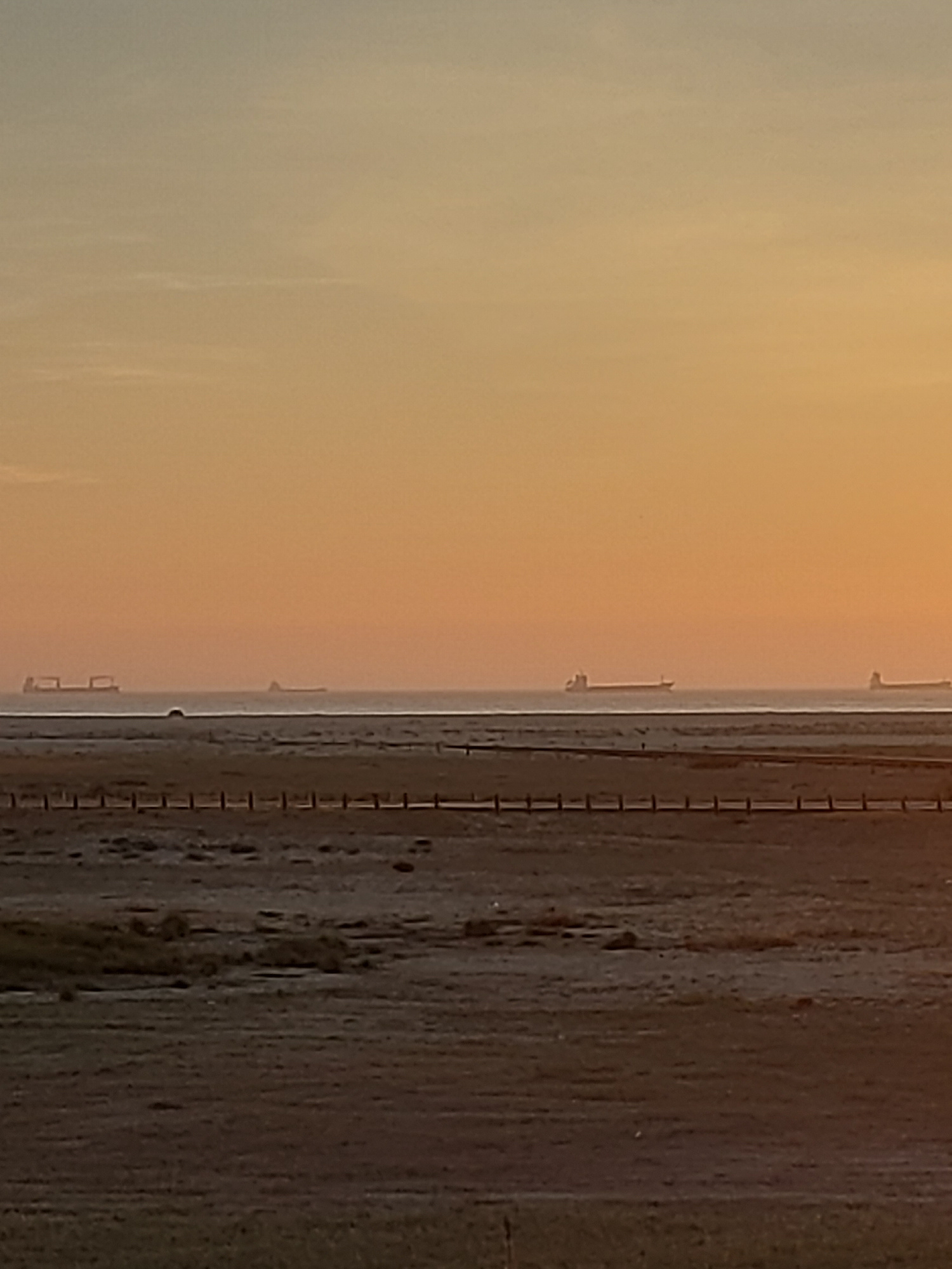 The image depicts a hazy, orange-tinged sky on the left, possibly suggesting either sunrise or sunset. Adjacent to the sky, a narrow strip of water is visible, possibly a river or the ocean. To the ri…read more