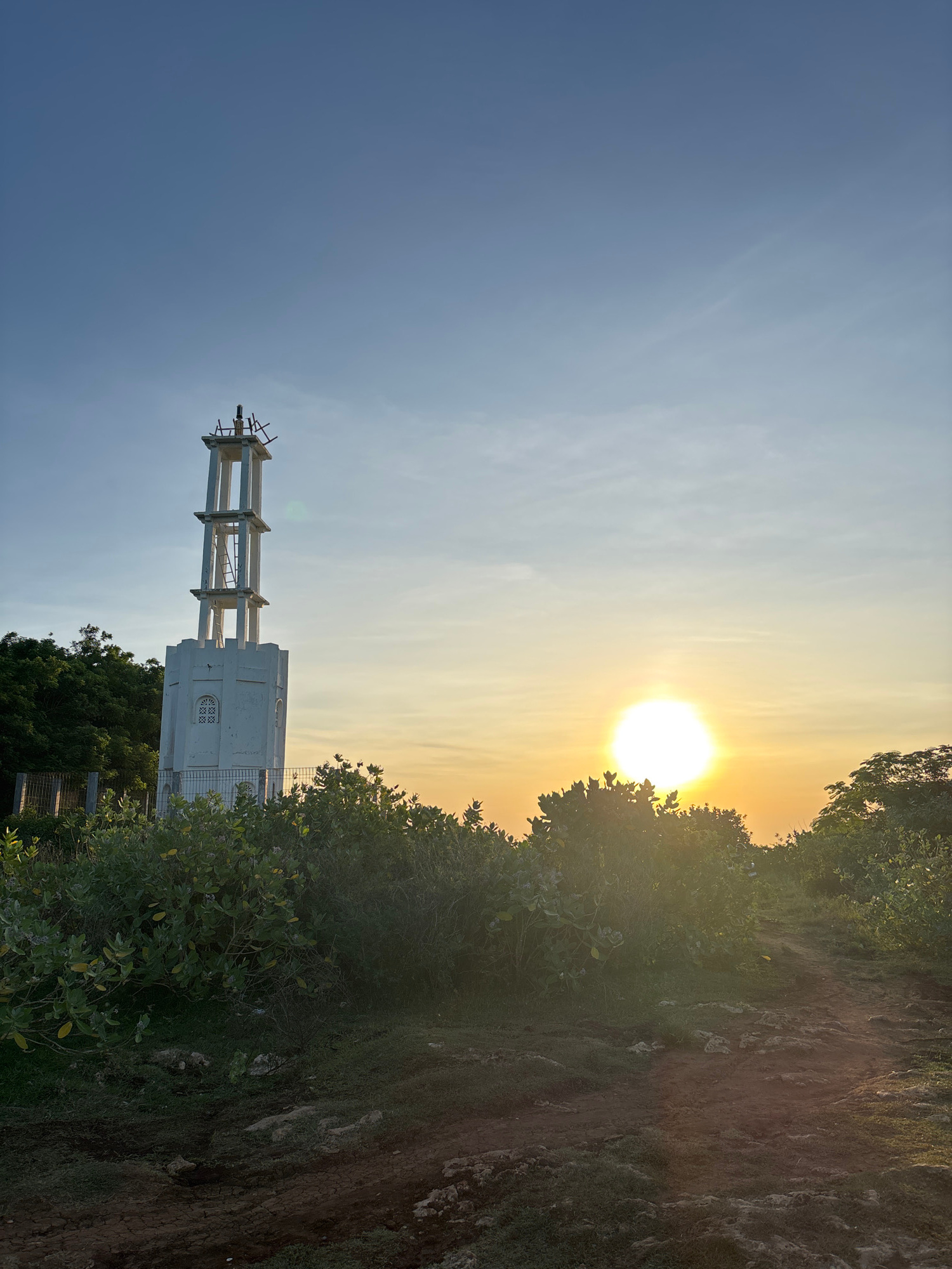 The image shows a vertical view of a white tower-like structure with a ladder attached to its side, set against a backdrop of a bright sky with the sun partially obscured by foliage. The tower's const…read more