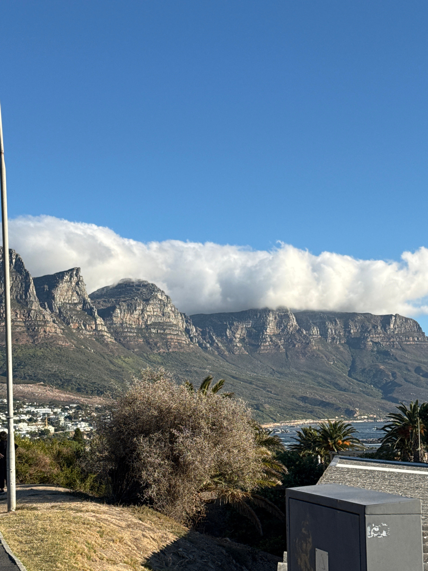 The image shows Table Mountain in Cape Town, South Africa, partially obscured by clouds. The sky is blue and clear on the left side of the image, contrasting with the white clouds that appear to be sp…read more