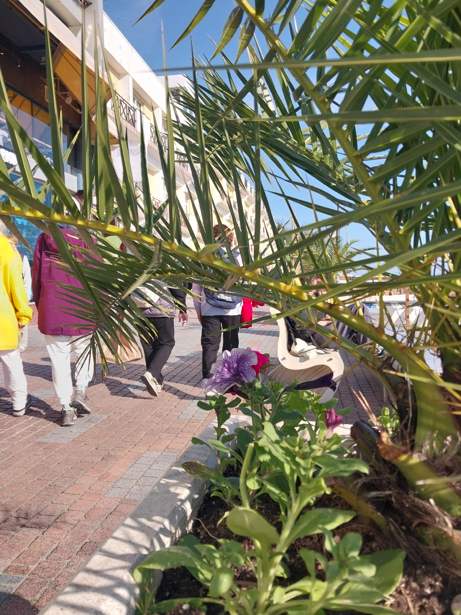 This image depicts a vibrant outdoor scene, likely a pedestrian area or promenade in a sunny location such as Sochi, Russia. The perspective is taken from slightly below eye level, looking upwards thrβ¦read more