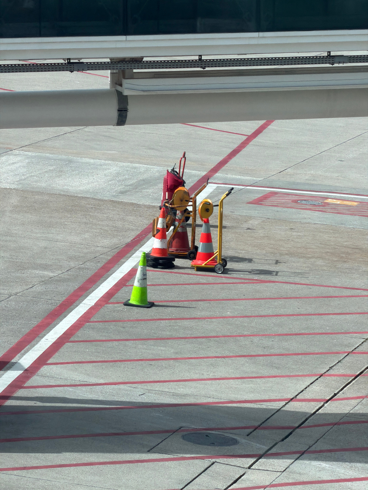 The image shows a section of an airport apron or tarmac. The surface is concrete, marked with red and white painted lines. Several orange and red traffic cones, some on yellow wheeled carts, are prese…read more