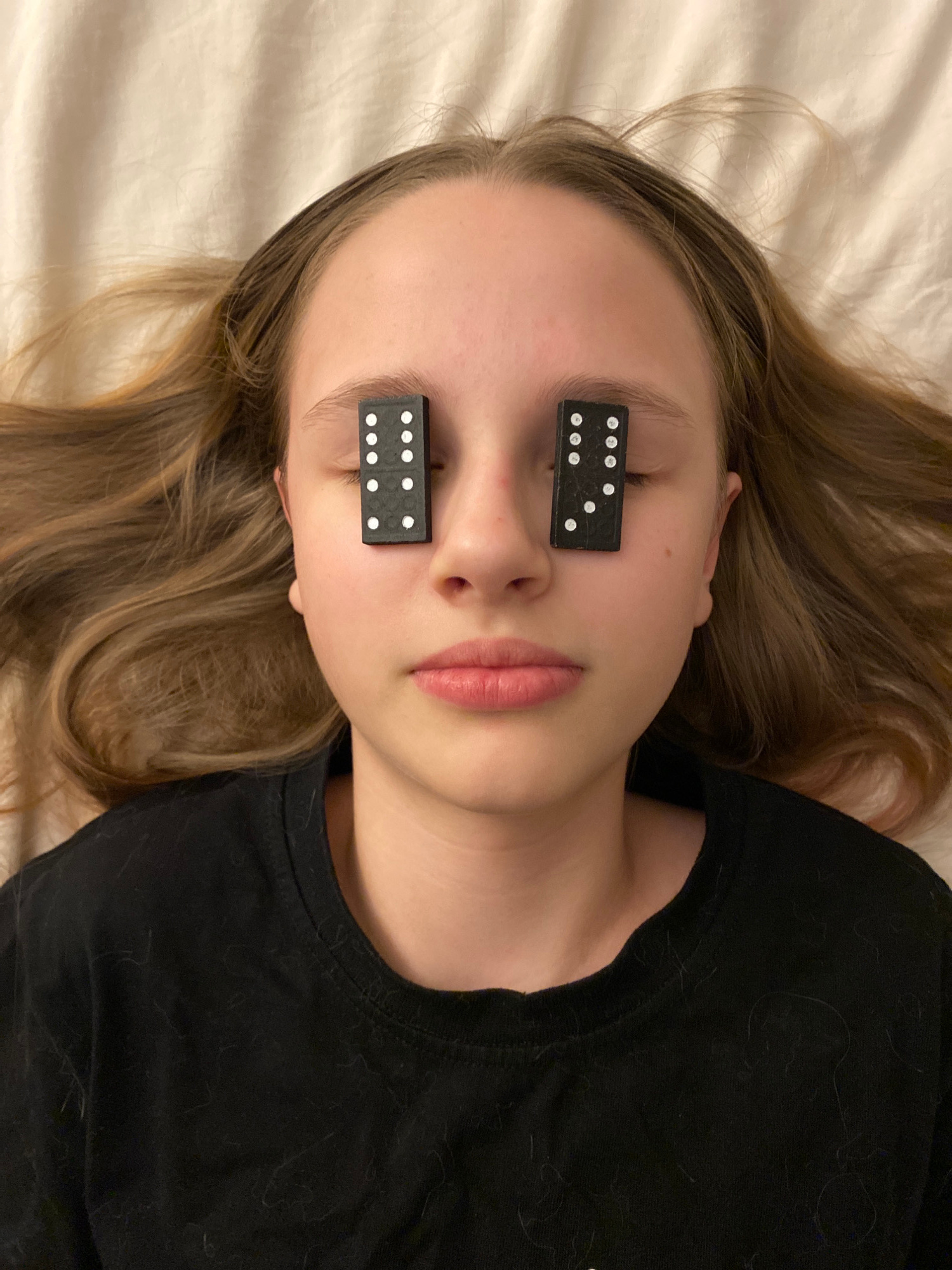 A person lies on their back on a light-colored fabric, possibly a bed sheet. The person has light skin, light brown hair with blonde highlights, and their eyes are covered by two black dominoes, each…read more