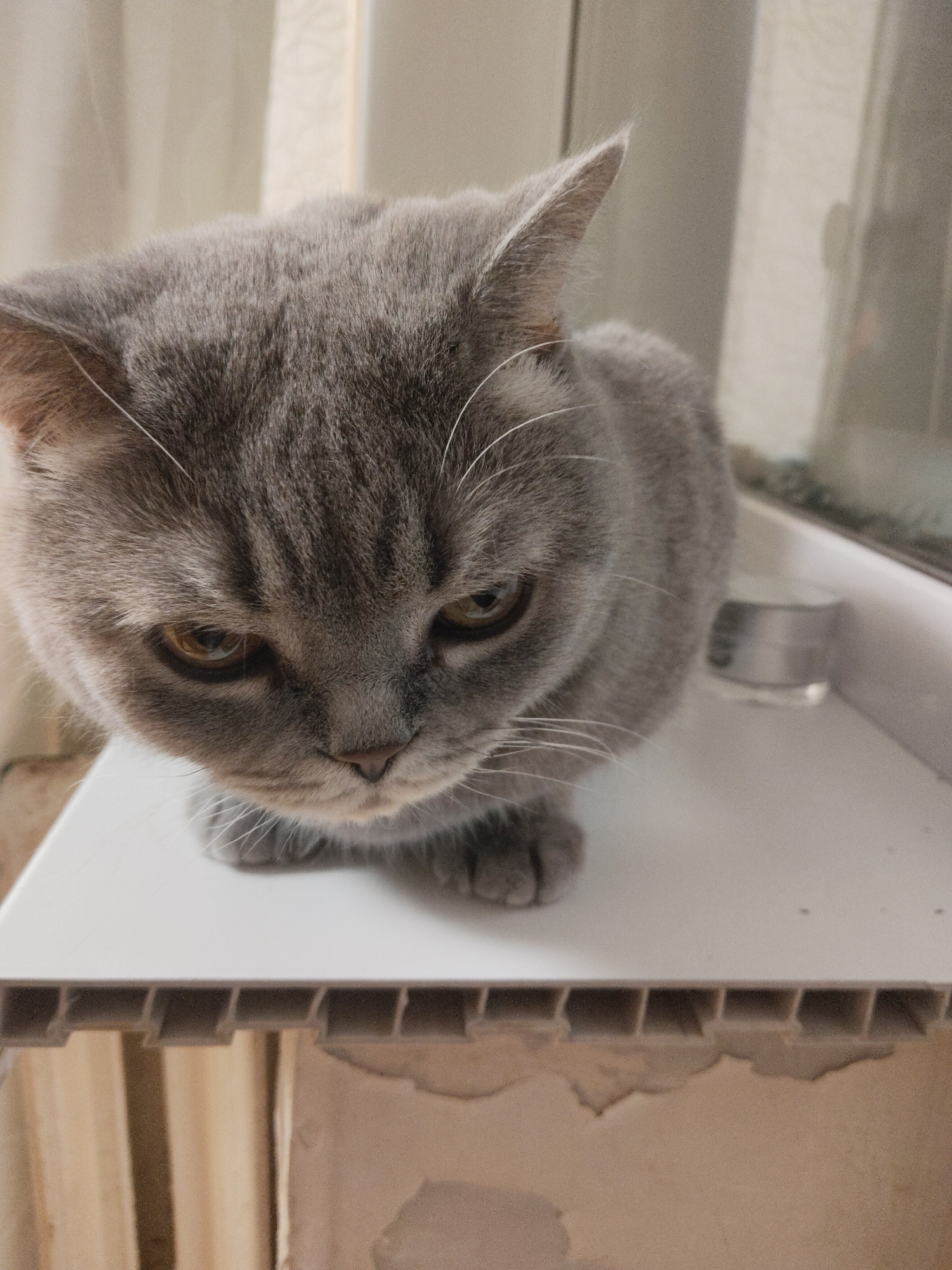 A gray cat sits on a white, corrugated surface. The cat's eyes are amber. A window with partially drawn curtains is behind the cat. An unknown object sits on the window sill. The location is Unknown,…read more