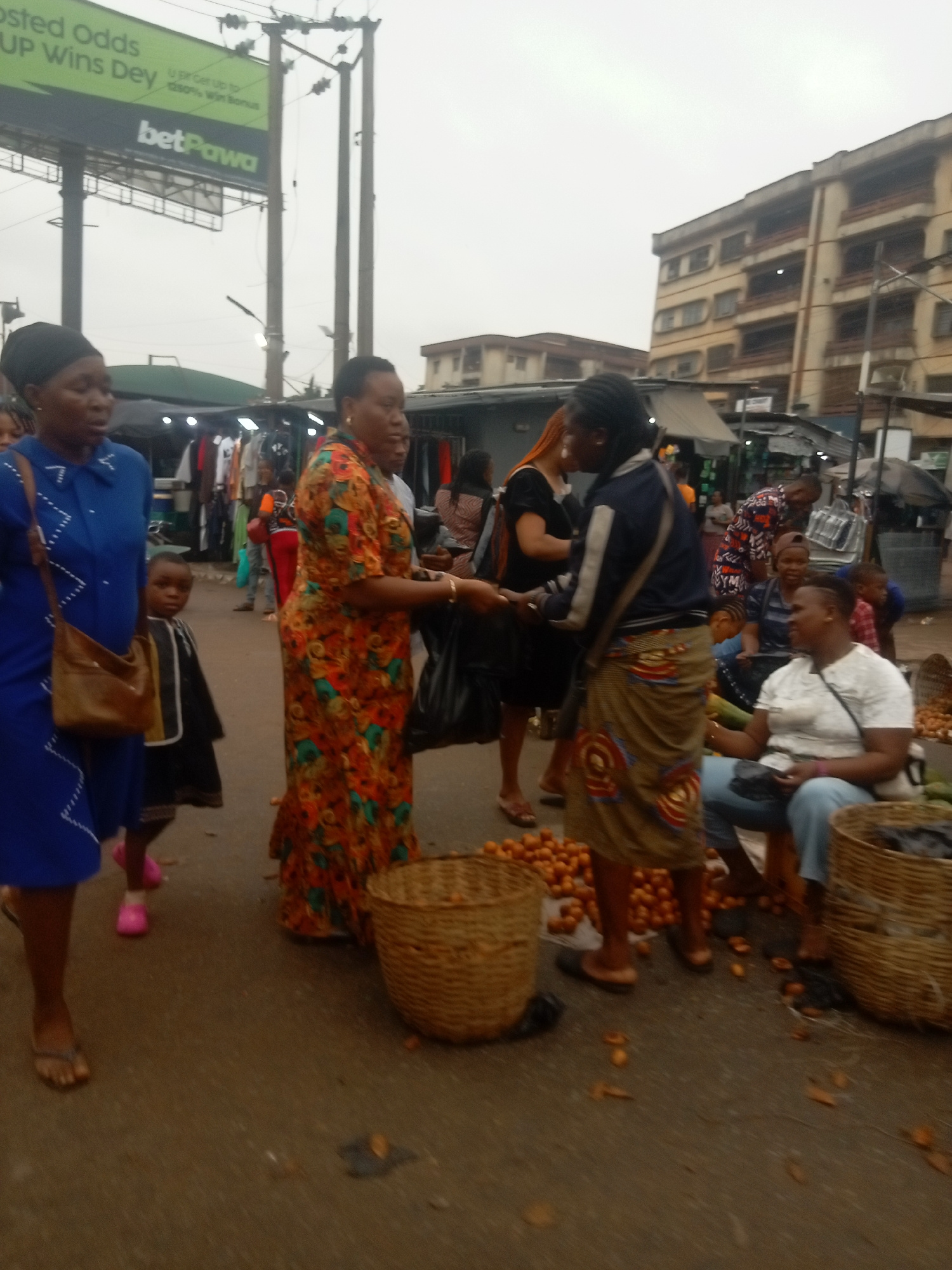 The image depicts a bustling street scene in Onitsha, Nigeria. Several people are present, engaged in commerce. A woman in a blue dress and a brown purse walks to the left, while another woman in an o…read more