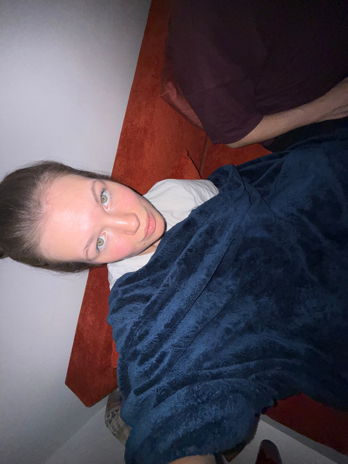 A person lies upside down on an orange couch, partially covered by a navy blue blanket. They wear a white shirt. A burgundy-colored object is on the left side of the couch. The person has fair skin, g…read more