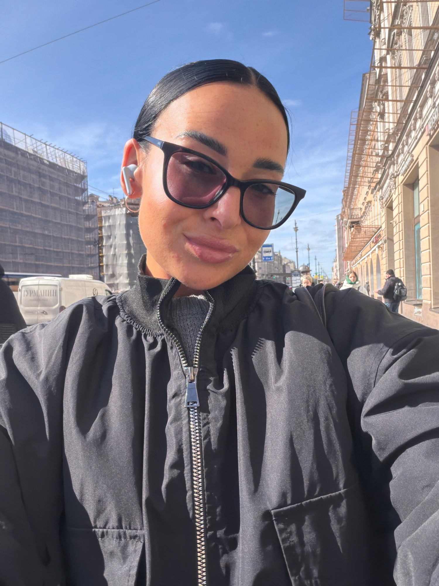 The image shows a person wearing sunglasses and a black jacket, standing on a street in Saint Petersburg, Russia. Buildings with scaffolding are visible in the background, as well as a blue sky. The p…read more