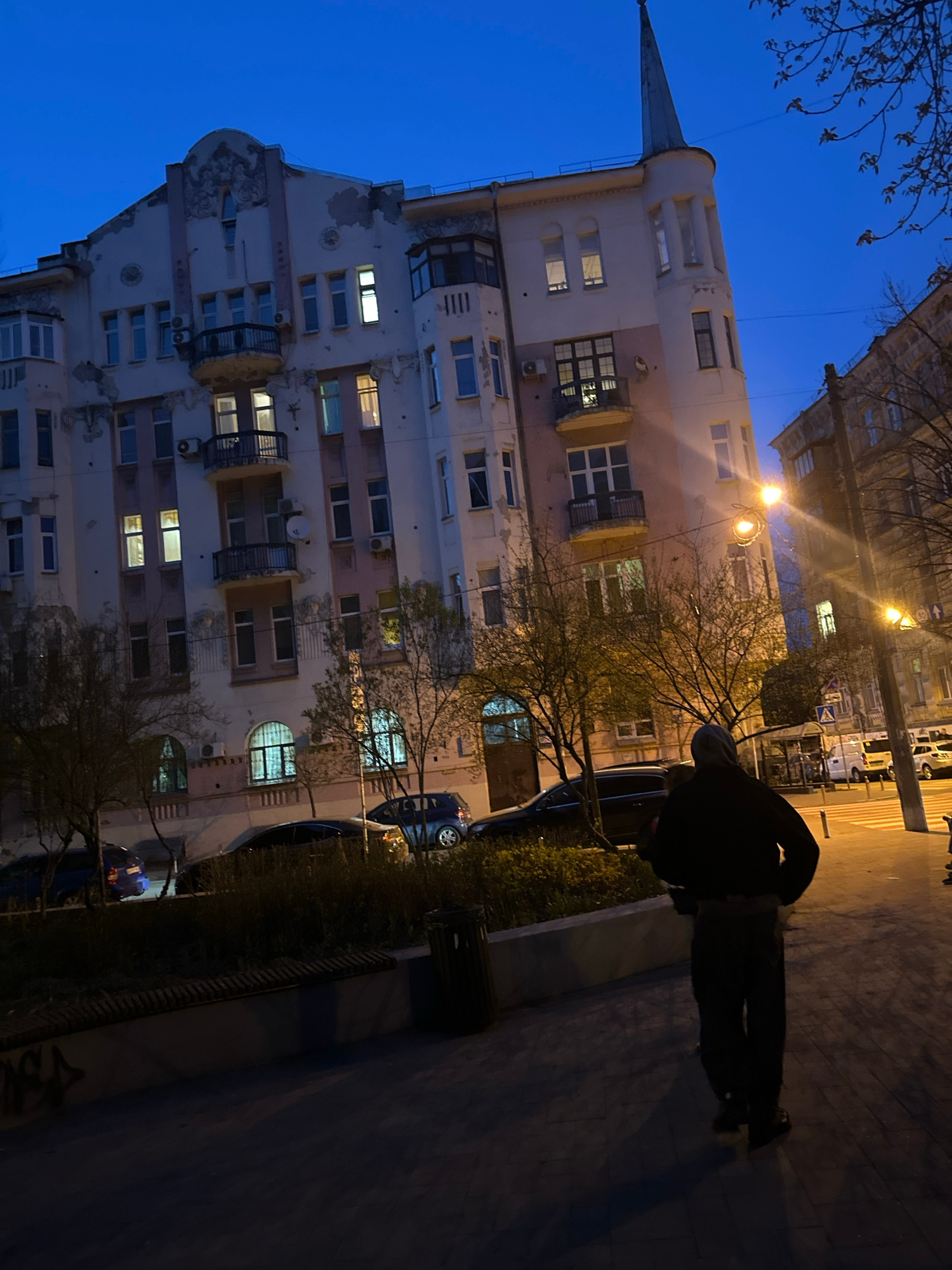 A street scene in Kyiv, Ukraine, at dusk. A tall, ornate building with a spire, multiple balconies, and illuminated windows is on the left. A person wearing a dark jacket and pants is standing on a si…read more