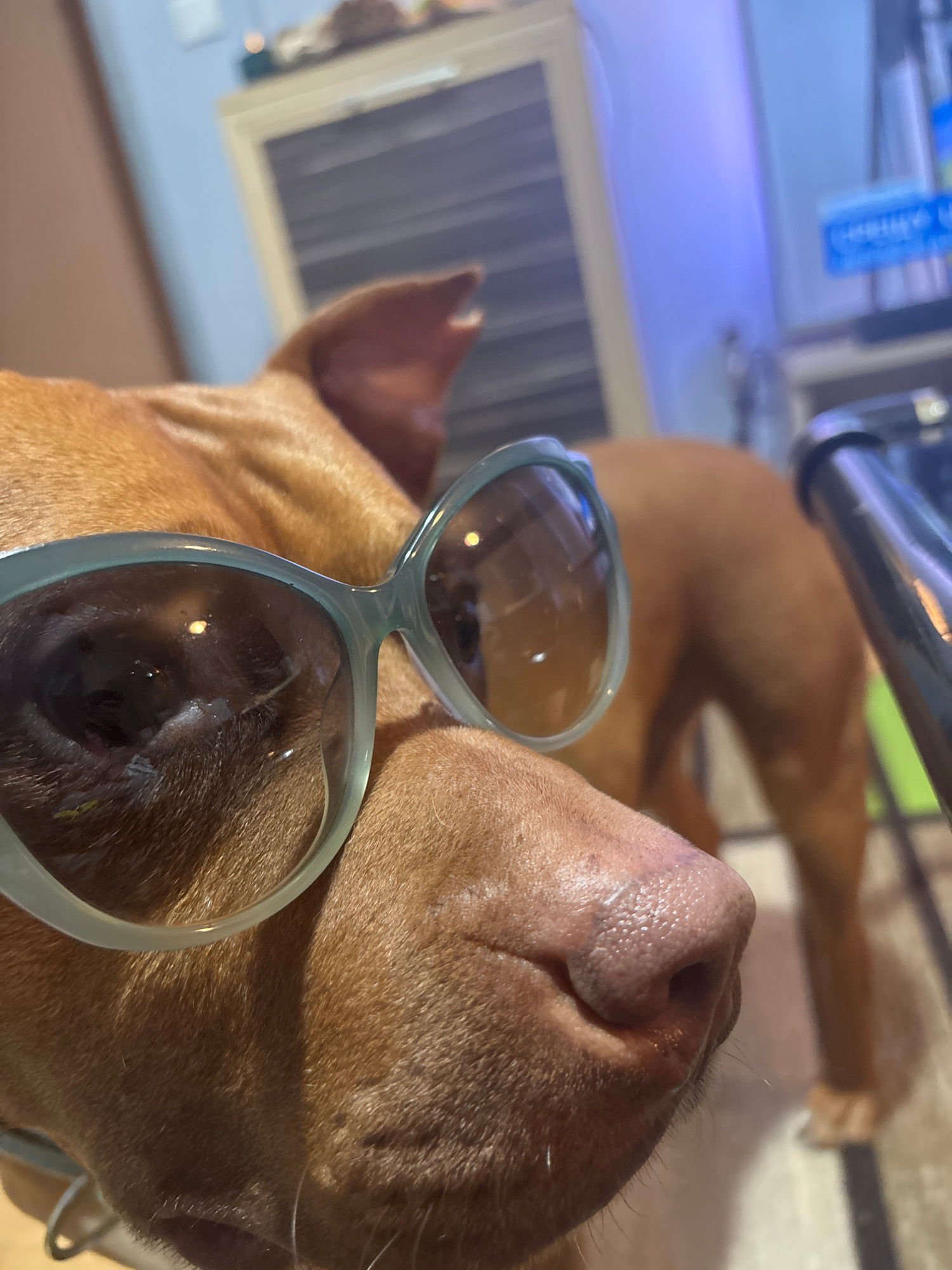 A close-up, low-angle photograph captures a reddish-brown dog, likely a Pit Bull or similar breed, wearing light blue-framed sunglasses indoors in Sofia, Bulgaria. The dog's head, with its moist, pink…read more