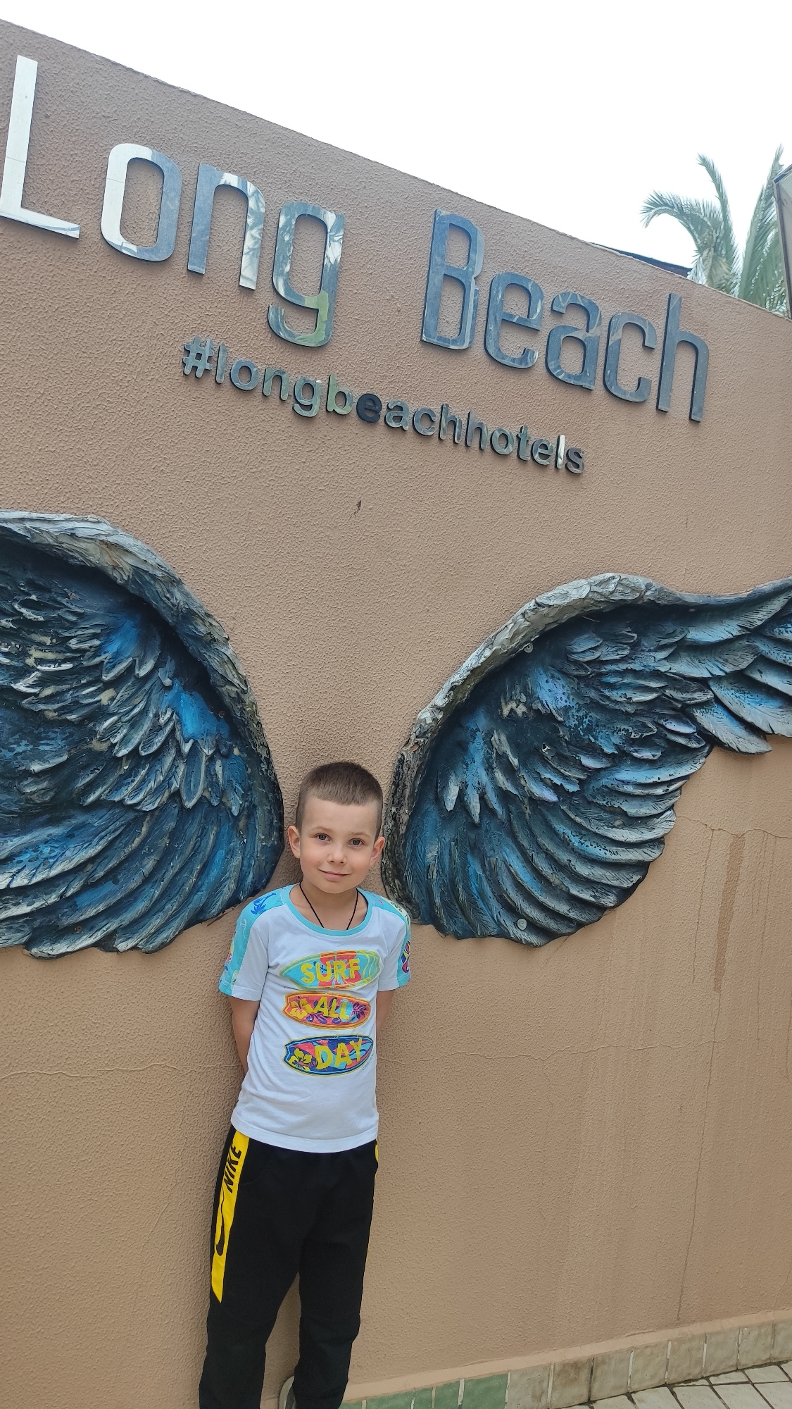 A frontal, full-body photograph captures a young male subject, approximately 6-8 years old, standing outdoors against a tan-colored, textured wall. The subject has short brown hair and wears a white t…read more