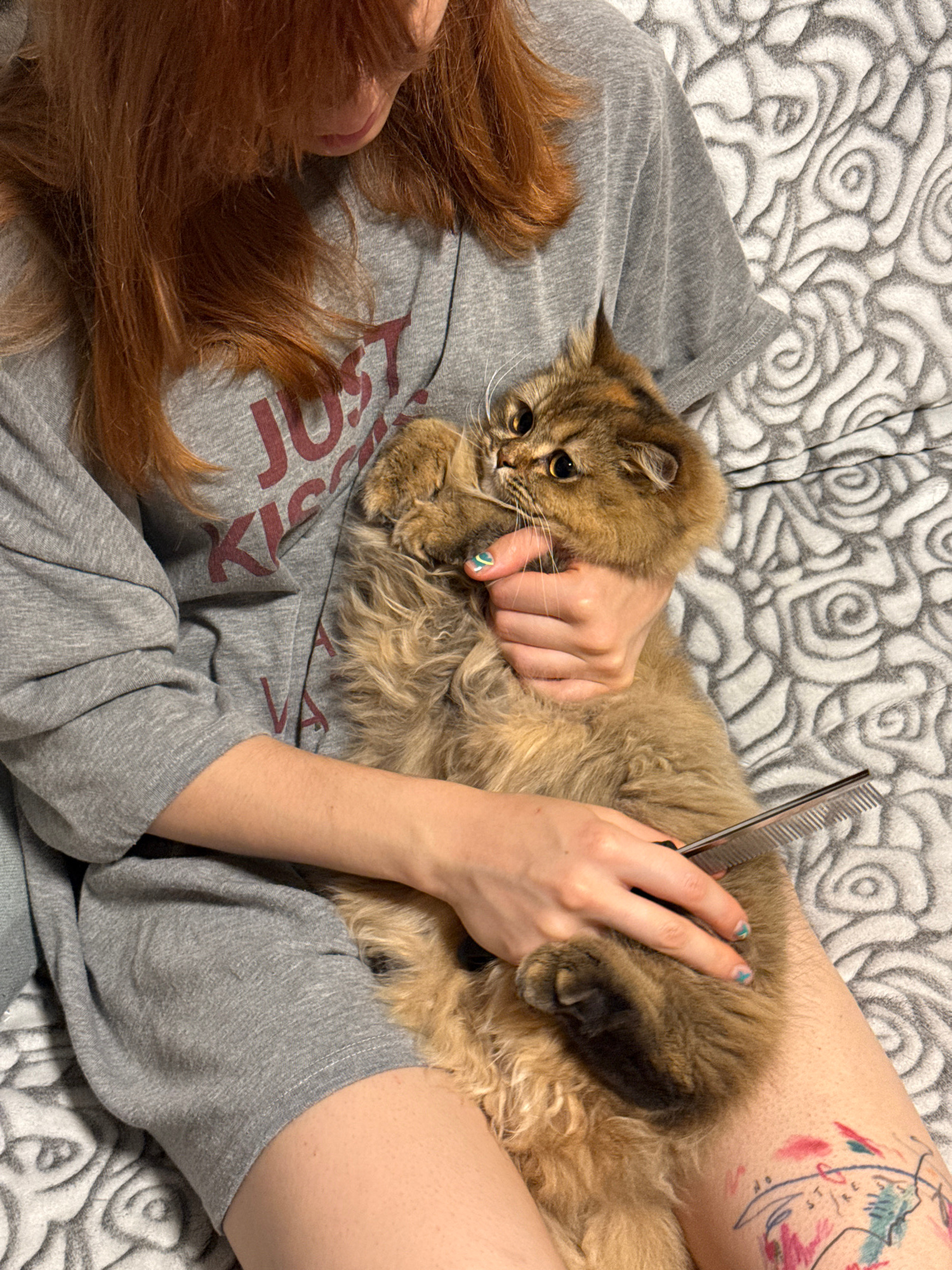 A woman with red hair, wearing a grey shirt, is sitting on a grey patterned blanket. She is holding and grooming a tan and brown cat with a metal comb. The woman's right leg, bearing a colorful tattoo…read more