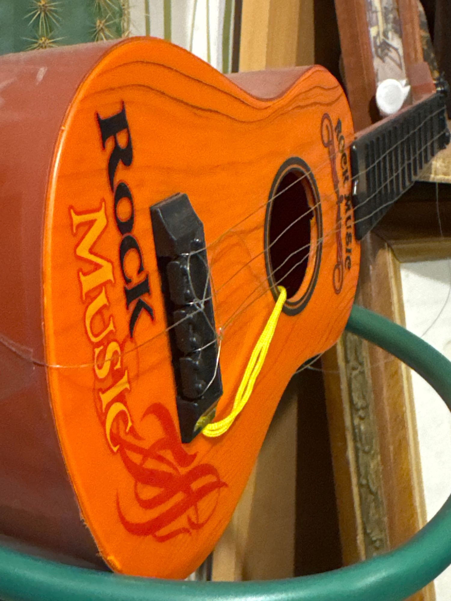 The image shows a toy guitar, orange with the words "Rock Music" printed on it. The guitar has a black bridge and a yellow cord running through the soundhole. It appears to be hanging on a green tubul…read more